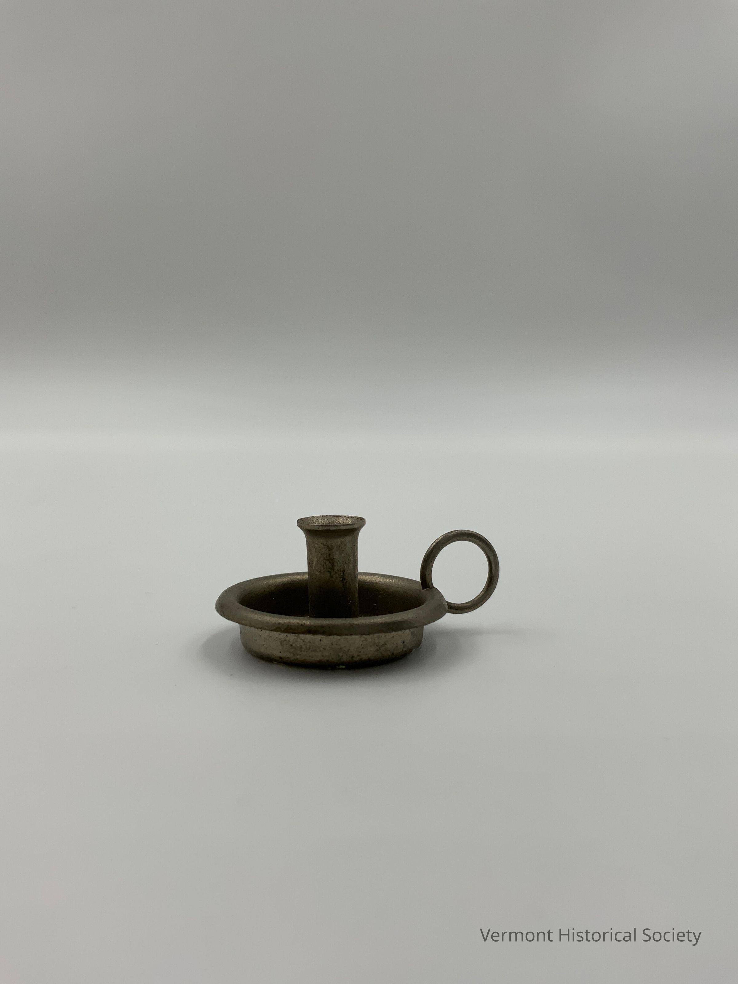 Miniature pressed tin chamber stick consisting of a round base, a central pedestal, and a round, wire handle.