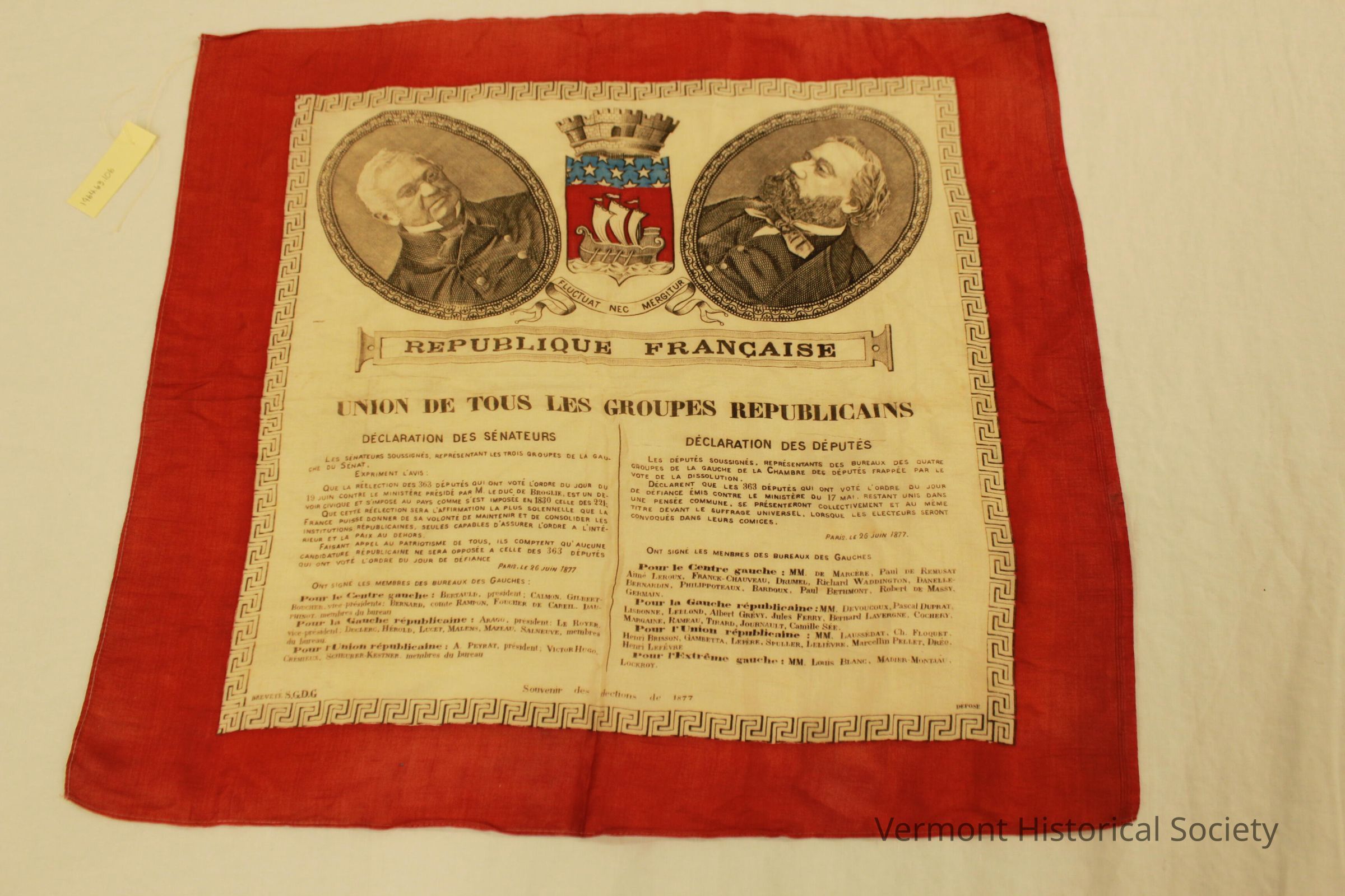 A silk scarf with a red edge, and two men's portraits in the top half with a ship and crown insignia. The words "Republique Francaise" is in the middle. Also on the scarf are declarations of senators and deputies. The scarf says it is a souvenir of the election of 1877.Context