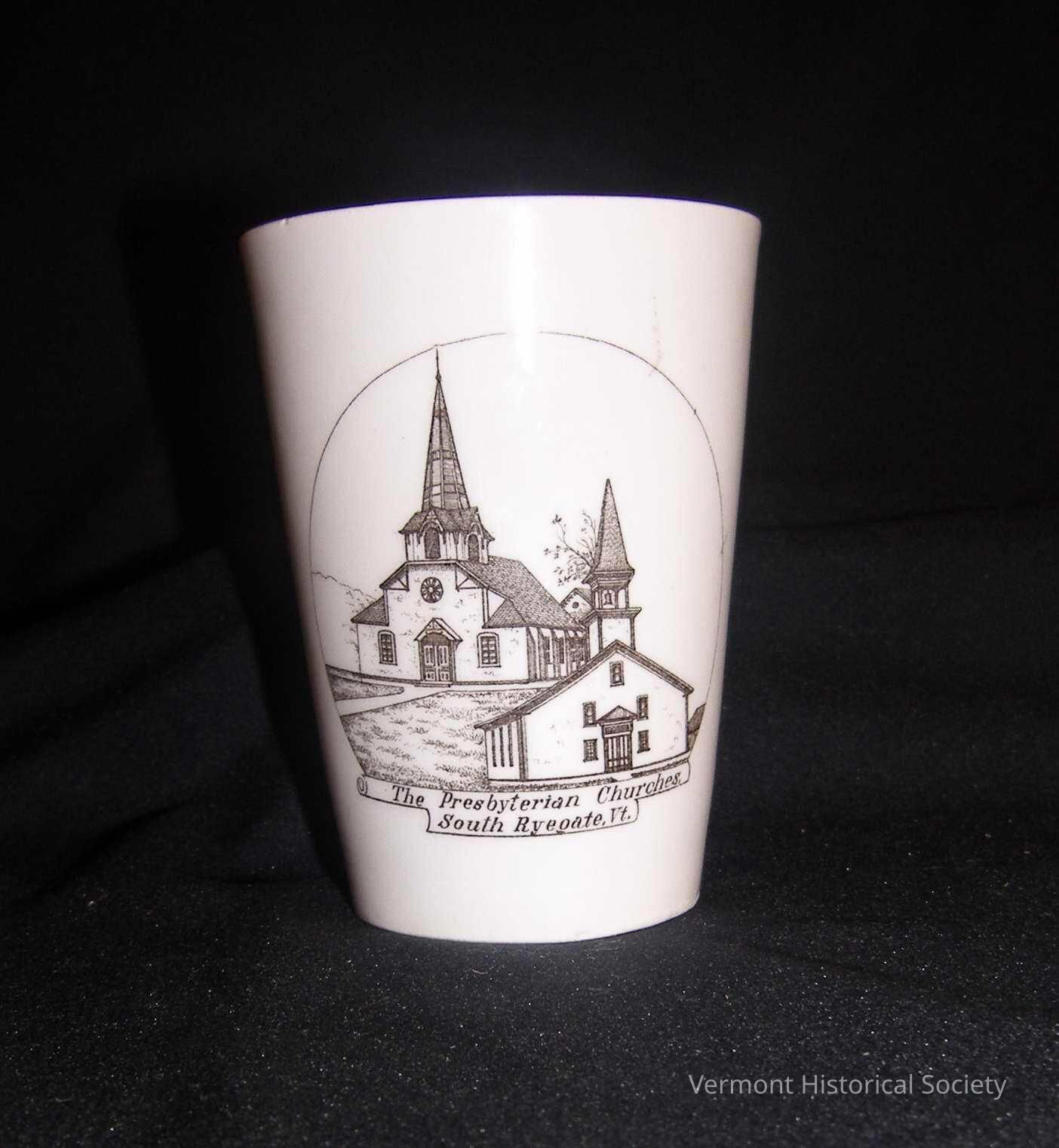 White ceramic tumbler printed with an illustration of two churches labeled, "The Presbyterian Churches, South Ryegate, Vt." The bottom is marked, "Made in Germany for B. L. TERRY South Ryegate, Vt."Context