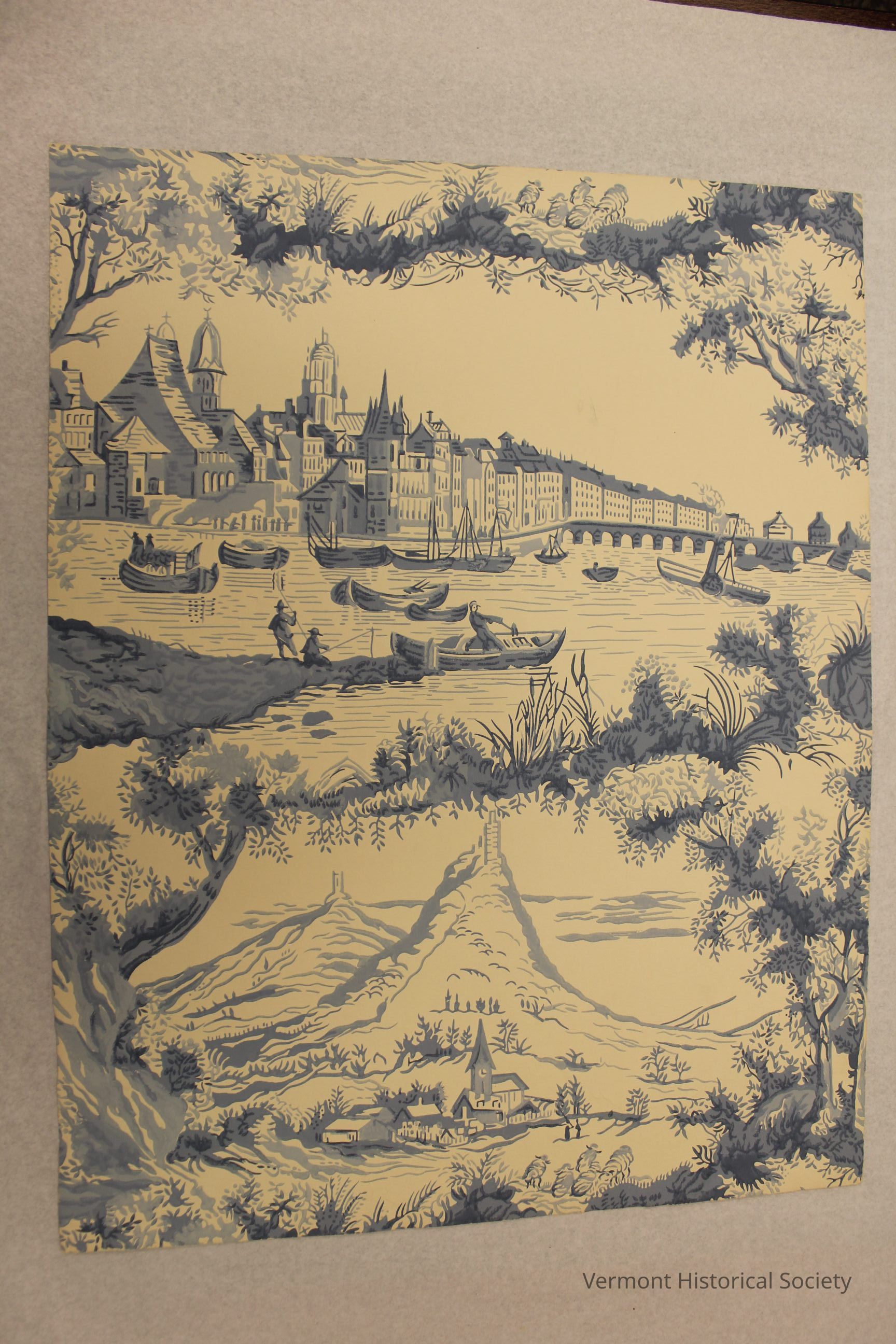 Wallpaper fragment printed in blue on a cream ground with a toile-like scenic pattern showing a coastal city and a mountain village. The top half shows a coastal city seen from the water, with several small fishing boats in the water. There are church steeples and row houses visible, and a long bridge spans the body of water to the right. The mountain village shows small houses and a church steeple at the base of two tall mountains, each topped with a tower. The scenes are surrounded by plants. The back is printed with the label, ""Lucerne" W 7712 E".