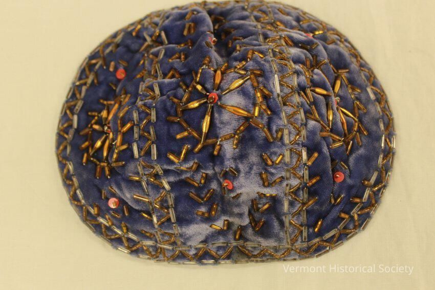 A blue velvet cap with gold and clear beads and some red dots sewn onto it.