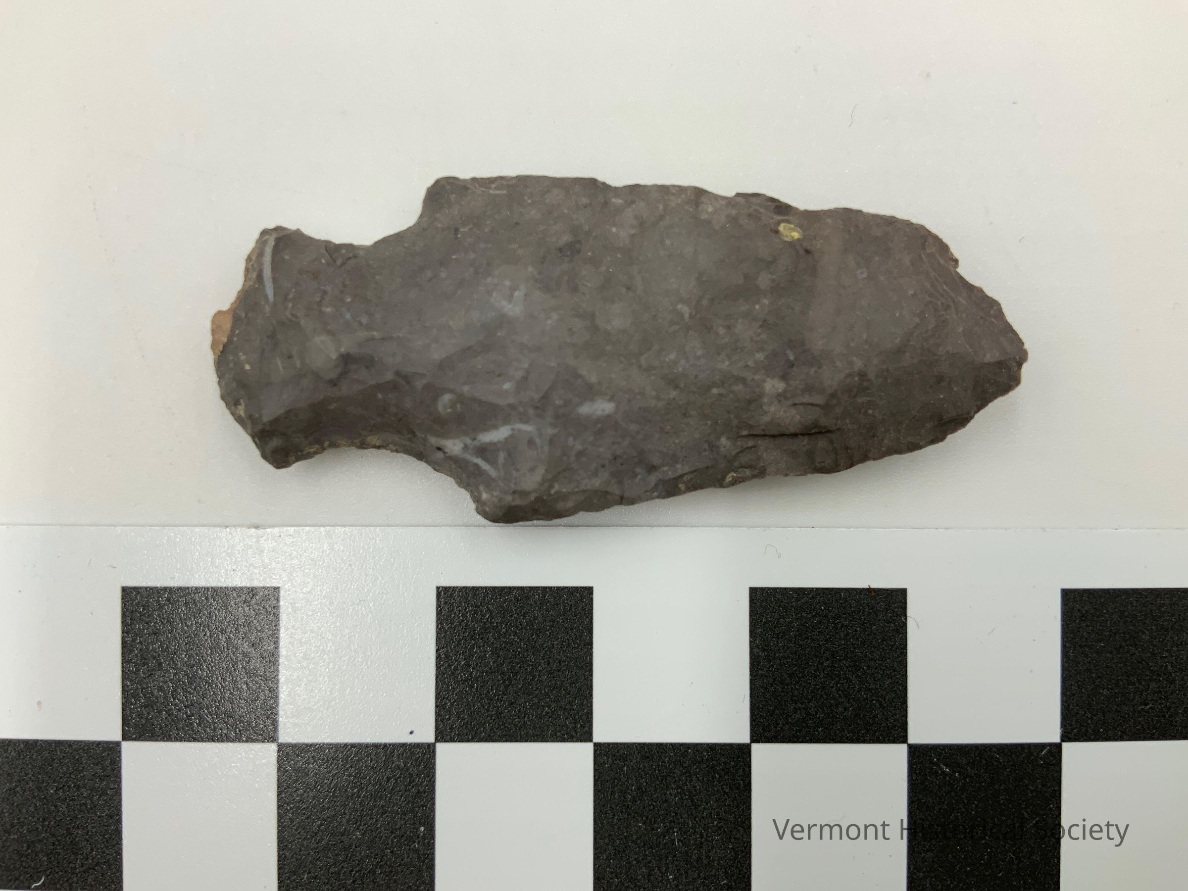 Gray chipped stone project al point with an expanding stem. The tip is rounded. The base flares and curves outward.