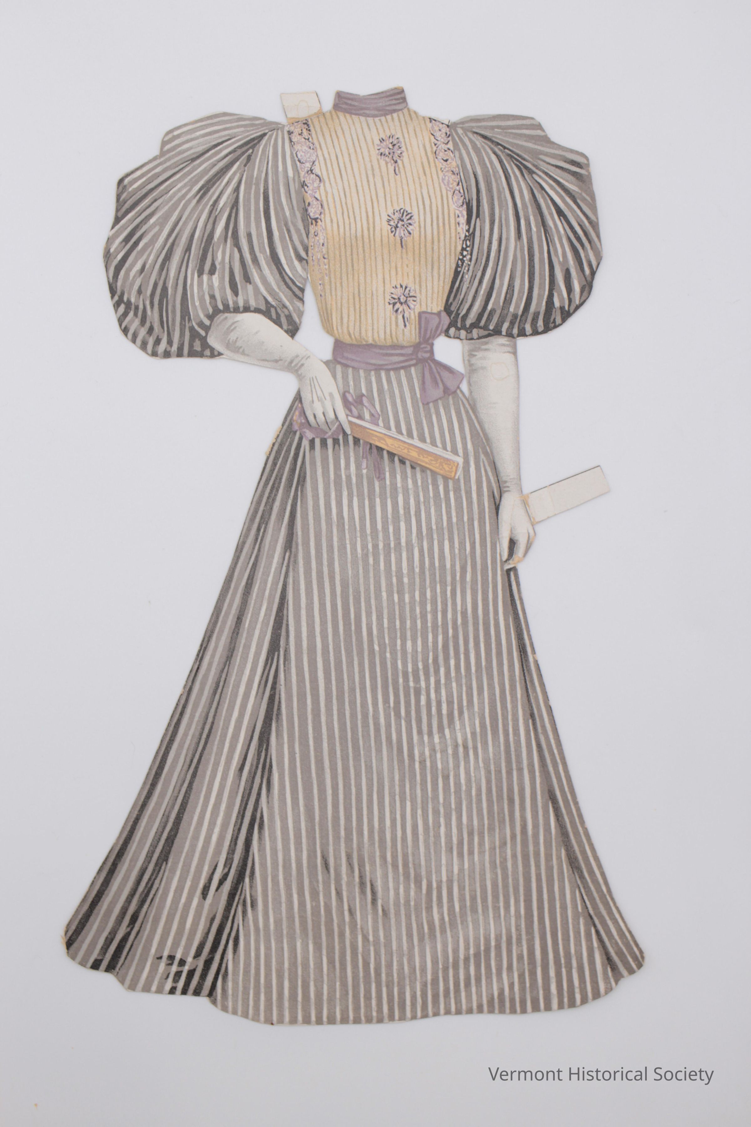 Grey striped paper doll dress with voluminous sleeves. The bodice is cream colored with three purple ornaments down the center front and a high neckline. The dress comes to a very narrow waist, accented with a purple ribbon. Beneath the large upper sleeves extend long white gloves. One hand is holding a closed fan. The back has the penciled initials, "C.M.B."Context