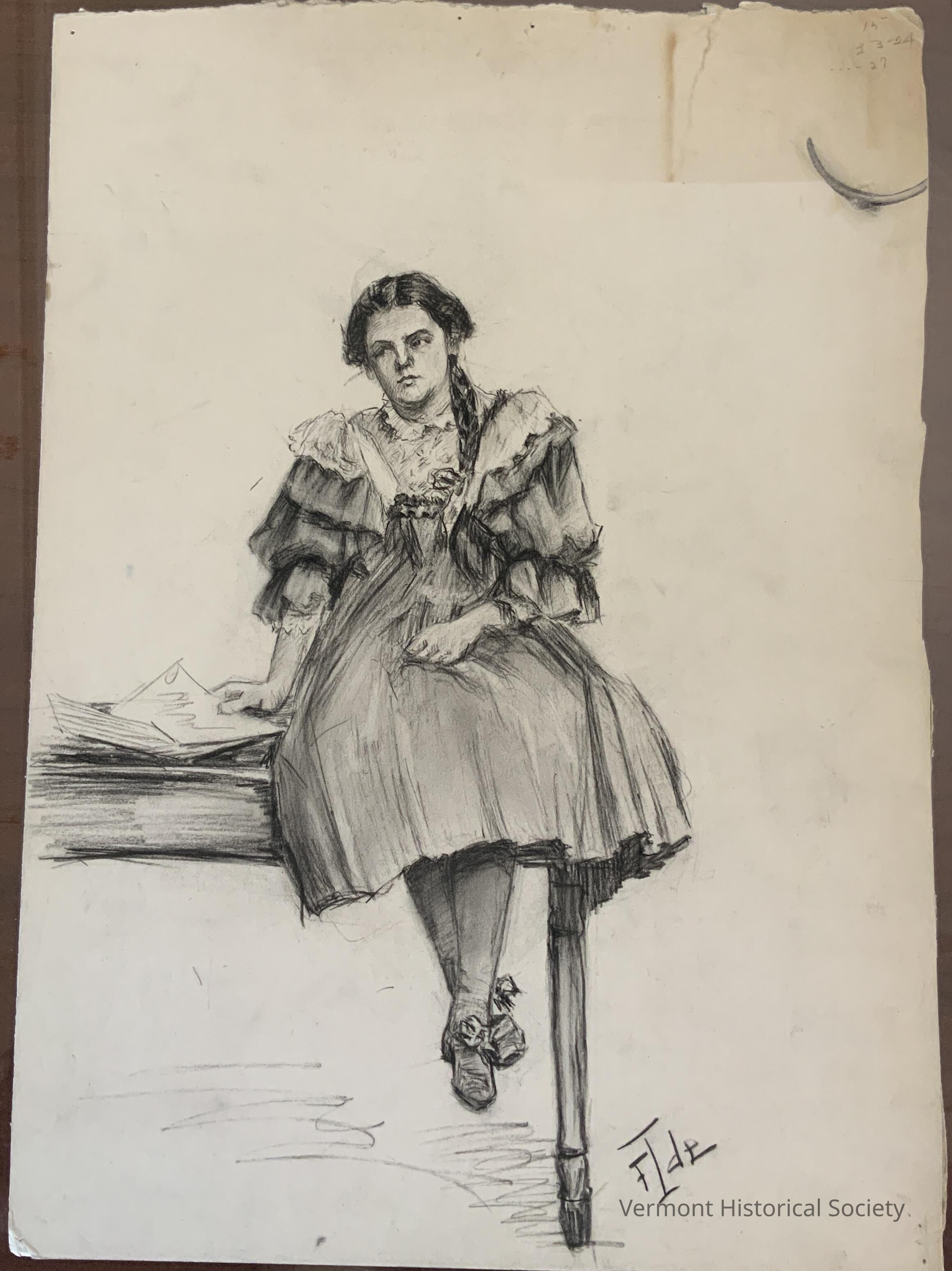A drawing of a woman sitting in the end of a table. She holds papers in her right hand and wears a dress with large ruffled sleeves. Her hair is braided. Signed in the bottom right corner and undated.Type of Drawing