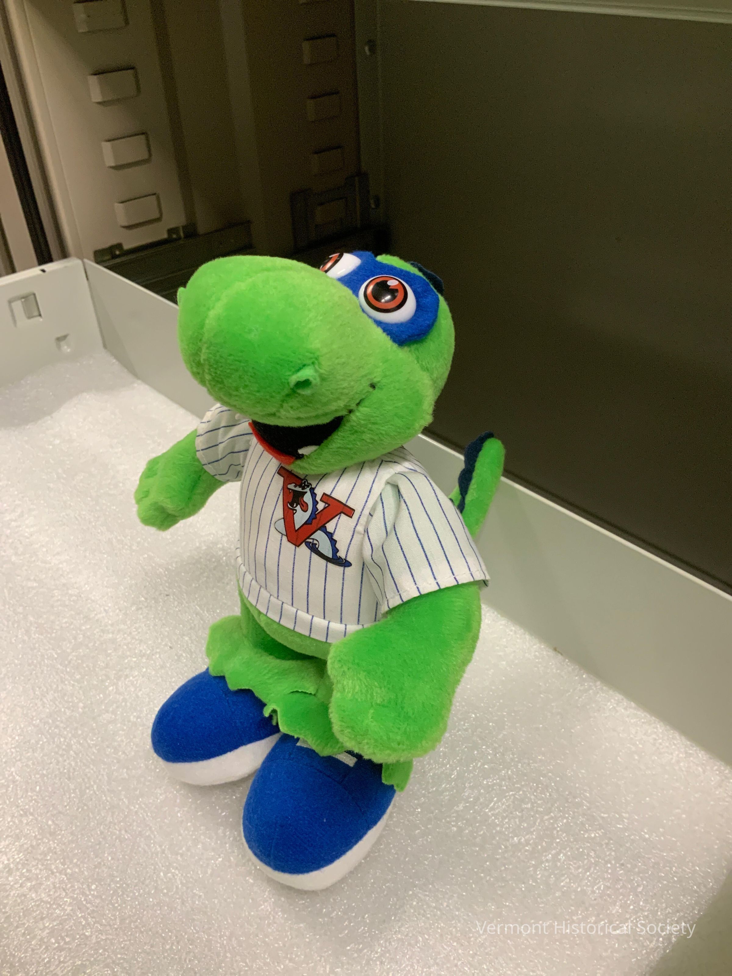 Stuffed animal representing "Champ", the mascot for the Vermont Expos baseball team. Green velour body with blue-trimmed eyes, large blue and white shoes, and wearing a white and blue-striped shirt with Vermont Expos logo at left breast. On back of shirt, in red letters: "CHAMP/ 0" Label under tail gives maker and fabric content.