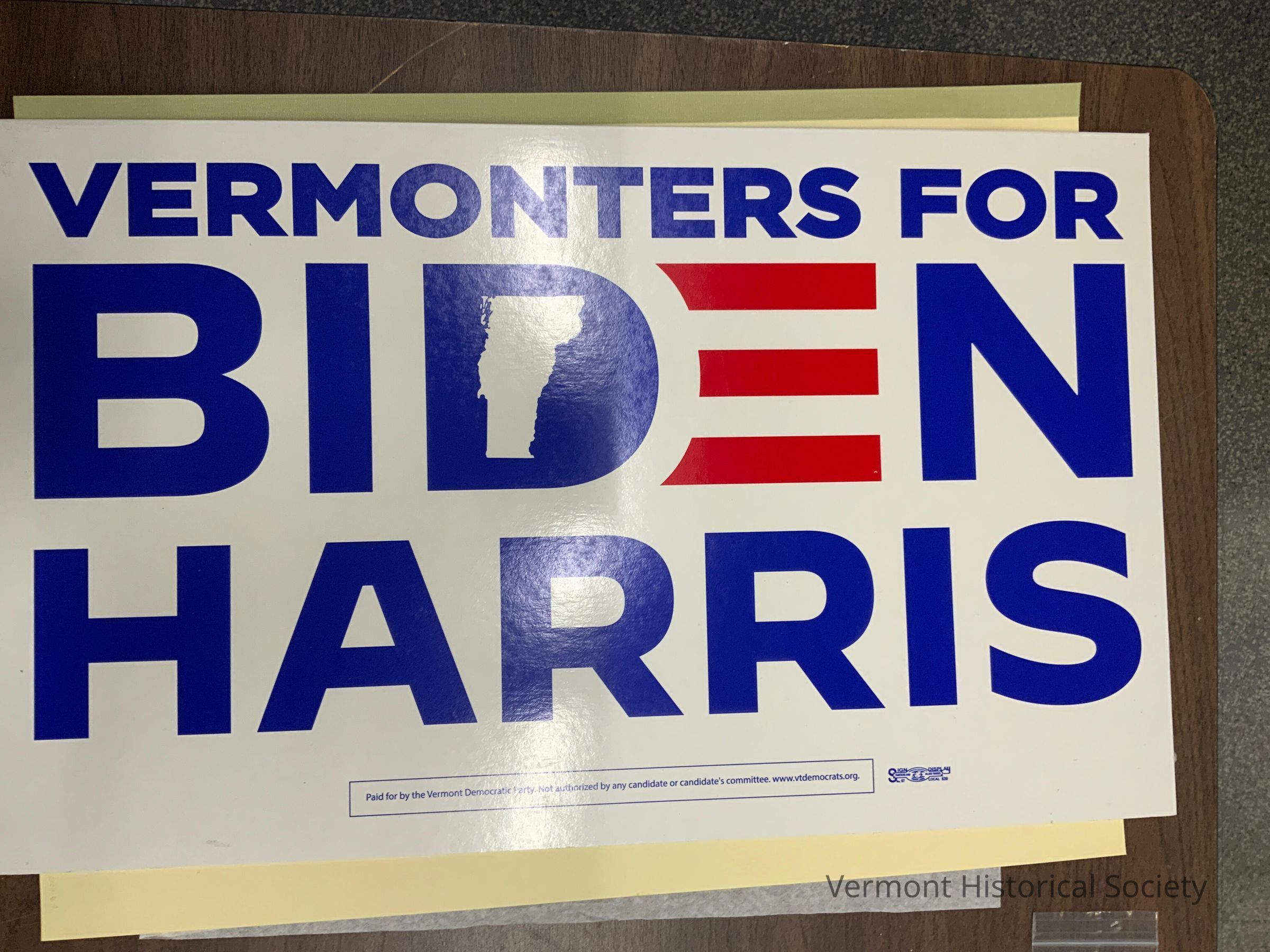 White, rectangular yard sign with inscription, "VERMONTERS FOR BIDEN HARRIS" in blue. The hole in the D of Biden is in the shape of the state of Vermont. The E of Biden is formed by three horizontal red lines.
