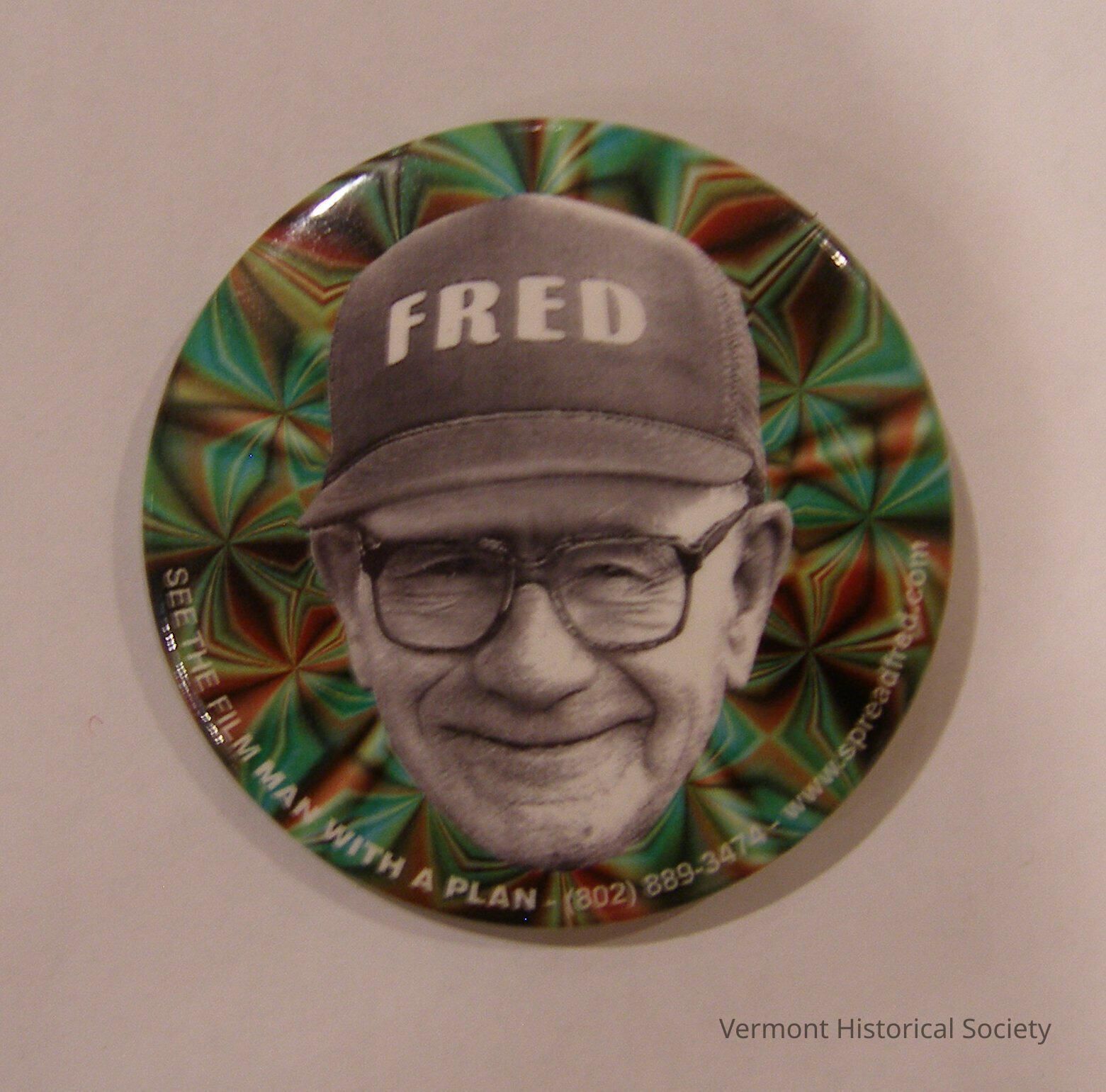 Round button with multicolored fractal background and a black-and-white photograph of a man wearing glasses and a brimmed cap with the word "FRED" across the crown. The small white inscription, "SEE THE FILM MAN WITH A PLAN (802) 889-3474 - www.spreadfred.com", rings the bottom edge of the button.Context