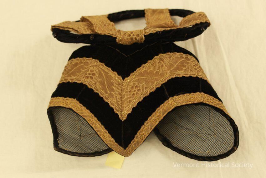 A blue velvet cap with gold ribbon trim, pointed edges on ears and forehead, hooks in back to tighten headband. A velvet-covered ring on top with gold ribbon. A blue and white lining. Three hat pins with black heads.Context