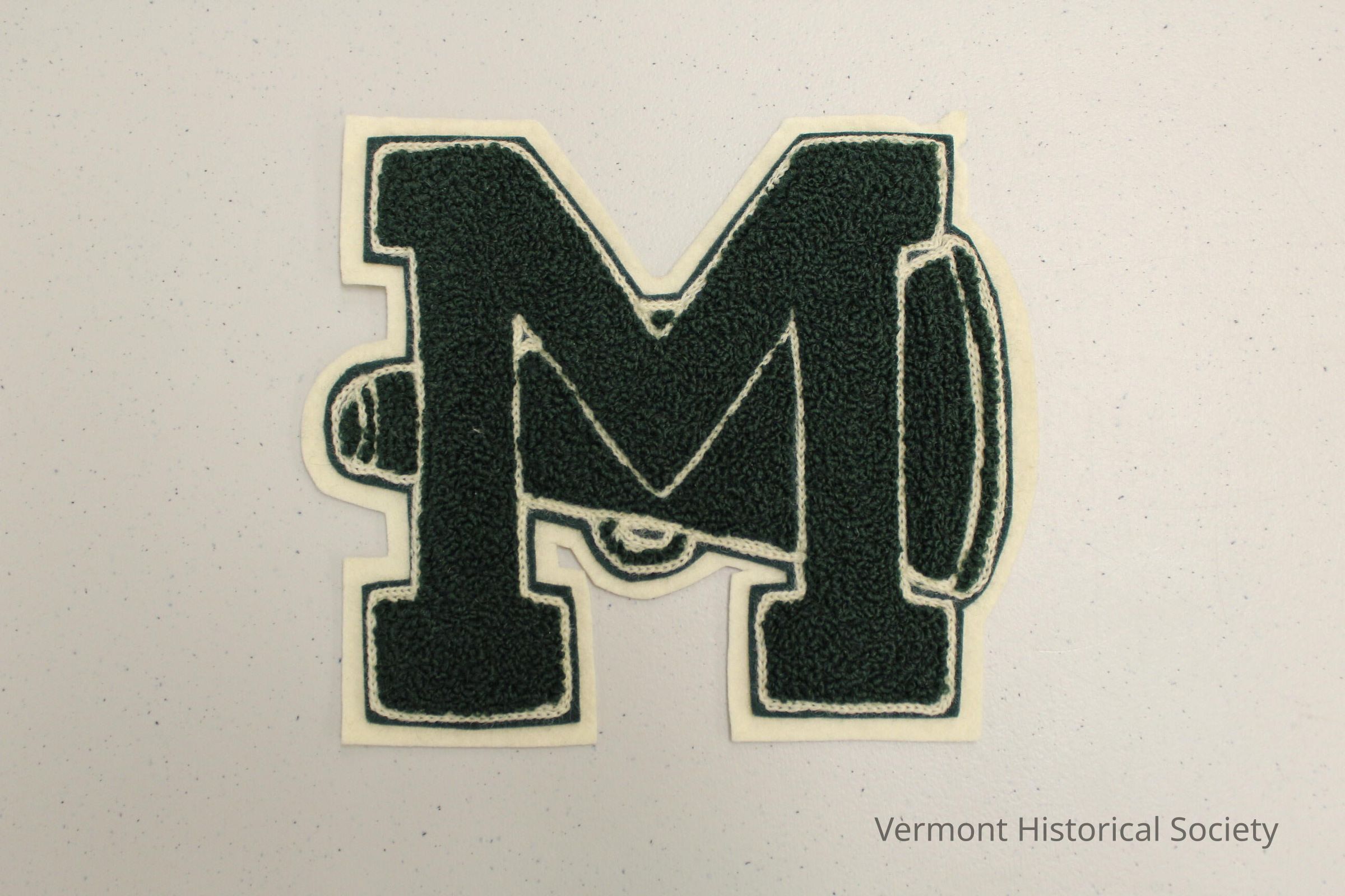 Green varsity letter in the shape of an M with a bullhorn behind it. The patch consists of a green looped pile fabric appliqued onto white felt. The outlines of the letter and bullhorn are accented with white embroidery in a chain stitch. The word, "Sandra", is handwritten with ink on the back.