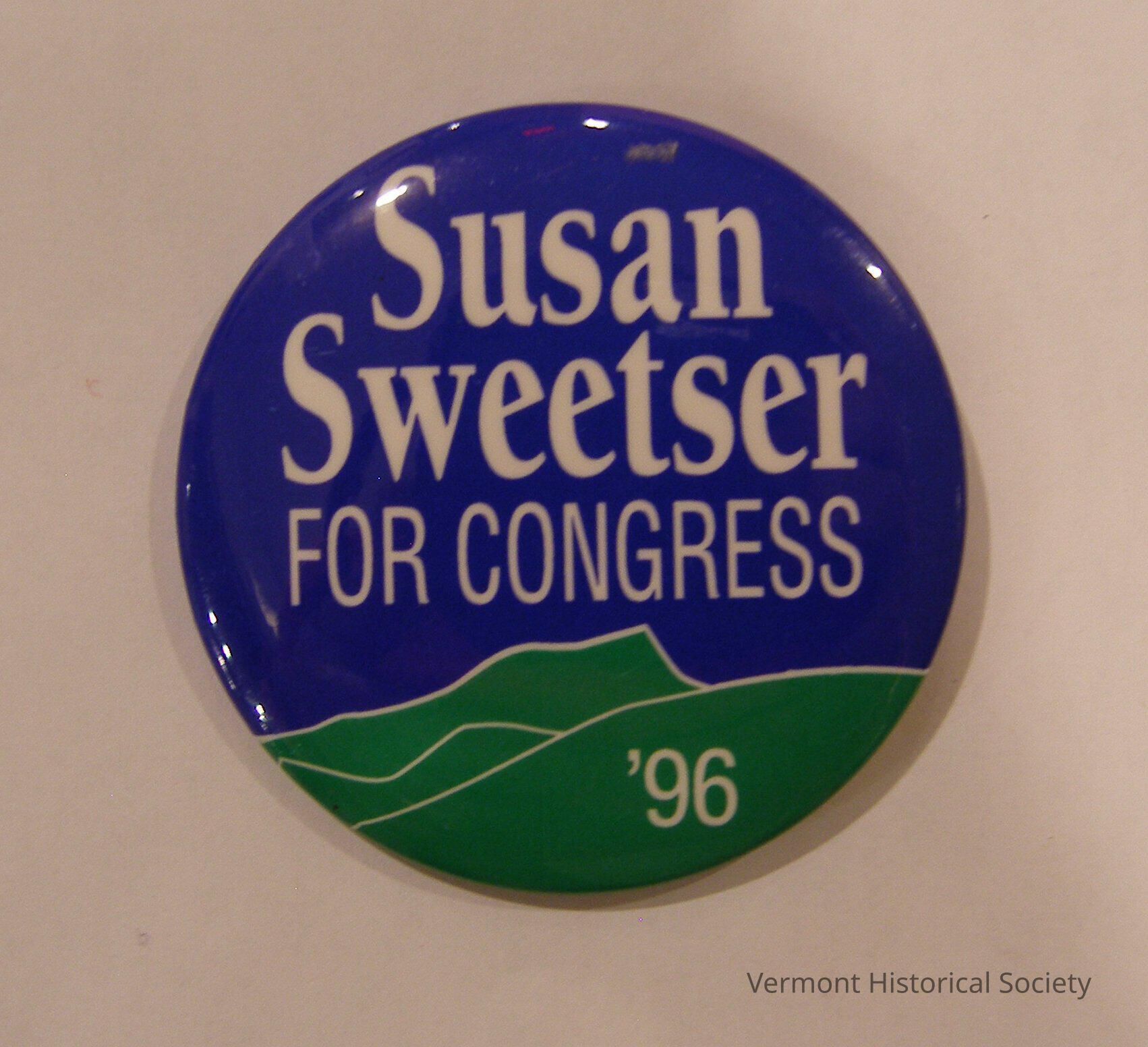 Round blue button with three green mountains across the bottom quarter. It has the white inscription, "Susan Sweetser FOR CONGRESS" on the blue, and "'96" on the mountains. In tiny print along the reverse edge of the top is the inscription, "PD. FOR BY SWEETSER '96 COMM. 139 MAIN STREET MONTPELIER, VERMONT 05602 (802) 229-1996".Context