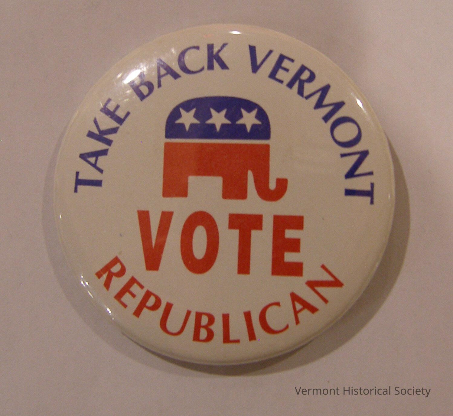 Round white button. Along the top edge of the button are the words "TAKE BACK VERMONT" printed in blue. In the center there is an image of the Republican elephant, top half blue with three white stars and the bottom half red, and the word "VOTE" written in red directly beneath the elephant. Along the bottom edge "REPUBLICAN" is written in red.