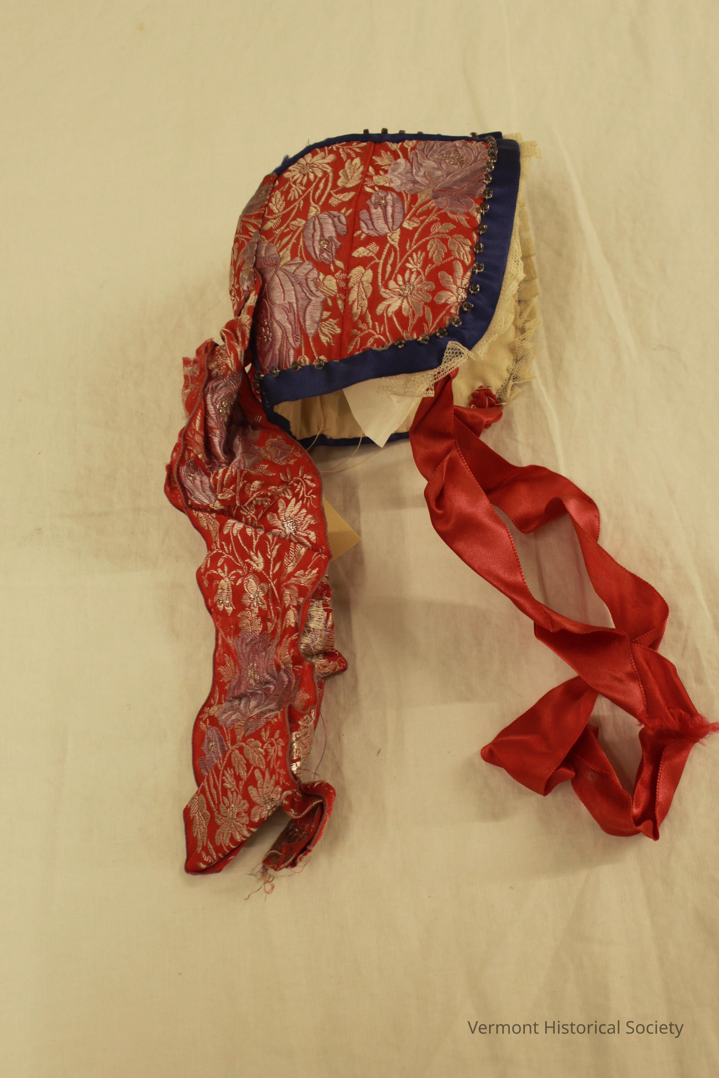 A child's bonnet of dusty rose and purple brocade, purple edging and lace around the face.