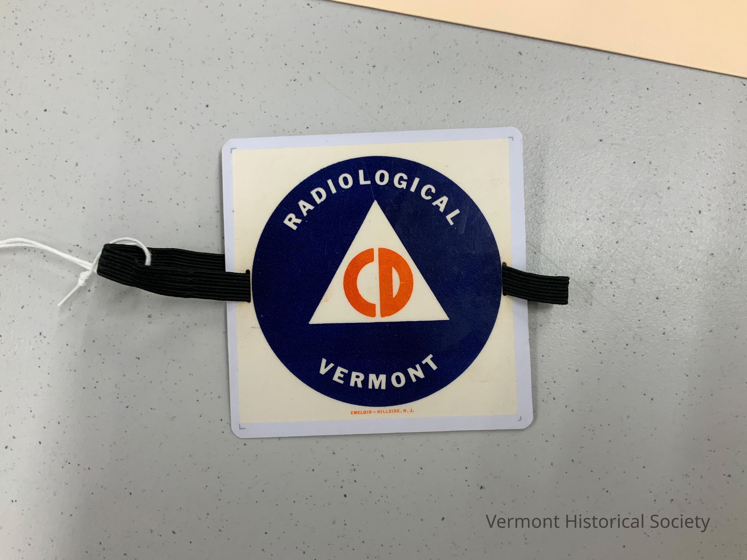 Armband consisting of a white plastic square and black elastic. The elastic attaches to the plastic on two sides, creating a loop. The plastic is printed with the Civil Defense logo (the red initials CD on a white triangle in a blue circle) with the words, "RADIOLOGICAL VERMONT".Context