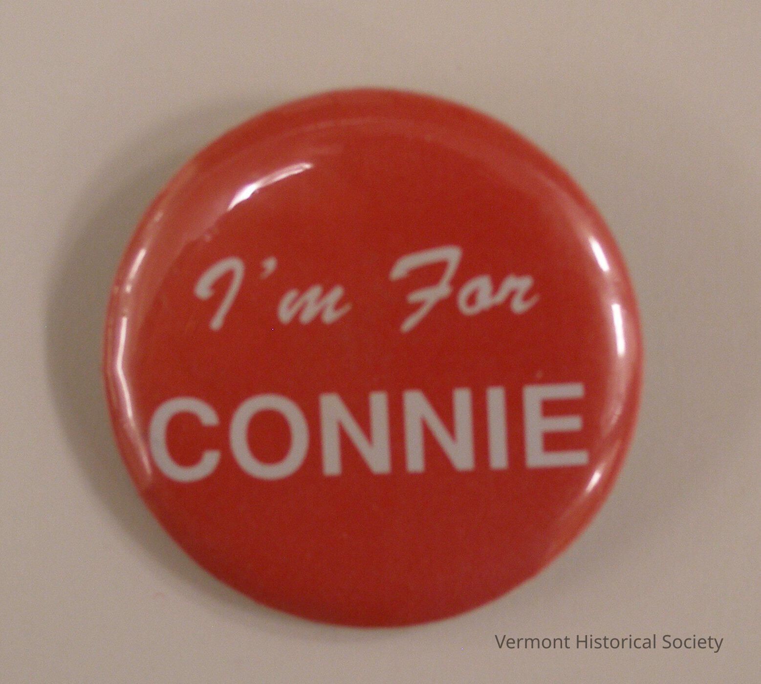 Round red button with the white inscription, "I'm For CONNIE". The first two words are in a script-style font.