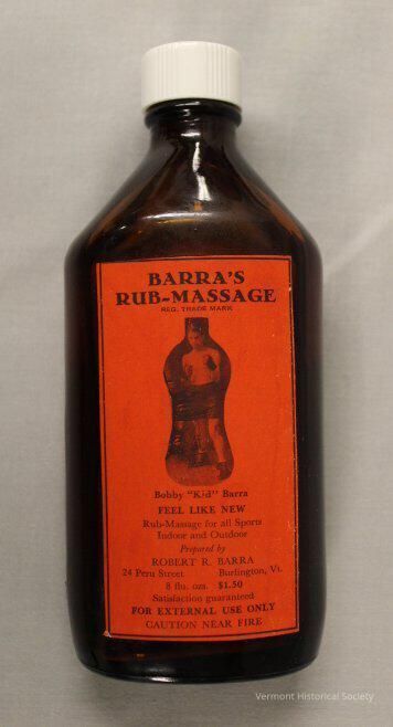 Brown glass medicine bottle with a white plastic cap. There are two rectangular paper labels on the either side of bottle, both orange. One has a photographic image of a boxer with the inscription, "BARRA'S RUB-MASSAGE REG. TRADE MARK Bobby "Kid" Barra FEEL LIKE NEW Rub-Massage for all Sports Indoor and Outdoor Prepared by ROBERT R. BARRA 24 Peru Street Burlington, Vt. 8 flu. ozs. $1.50 Satisfaction guaranteed FOR EXTERNAL USE ONLY CAUTION NEAR FIRE". The other label has directions for use, and list of uses, and ingredients.Context