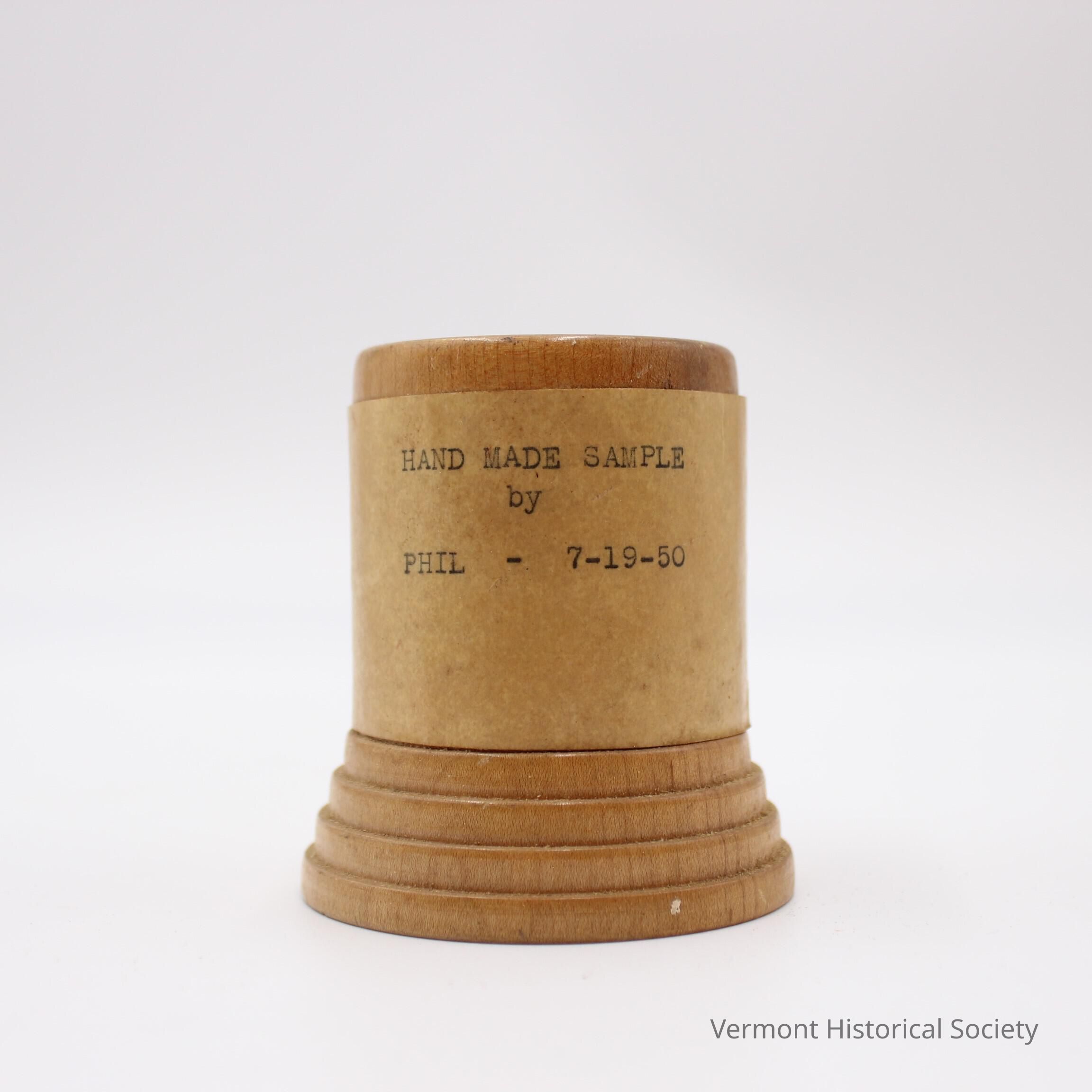 Unpainted, cylindrical wooden base with a stepped bottom. It is wrapped with a paper label with the typed inscription, "HAND MADE SAMPLE/by/PHIL - 7-19-50".Context