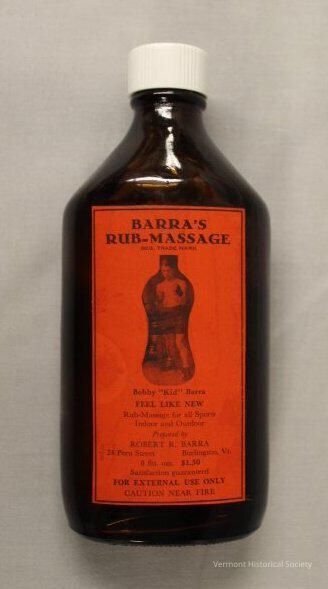 Brown glass medicine bottle with a white plastic cap. There are two rectangular paper labels on the either side of bottle, both orange. One has a photographic image of a boxer with the inscription, "BARRA'S RUB-MASSAGE REG. TRADE MARK Bobby "Kid" Barra FEEL LIKE NEW Rub-Massage for all Sports Indoor and Outdoor Prepared by ROBERT R. BARRA 24 Peru Street Burlington, Vt. 8 flu. ozs. $1.50 Satisfaction guaranteed FOR EXTERNAL USE ONLY CAUTION NEAR FIRE". The other label has directions for use, and list of uses, and ingredients.Context