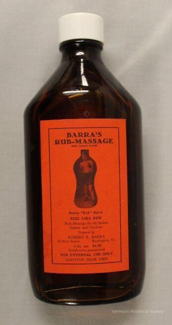 Brown glass medicine bottle with a white plastic cap. There are two rectangular paper labels on the either side of bottle, both orange. One has a photographic image of a boxer with the inscription, "BARRA'S RUB-MASSAGE REG. TRADE MARK Bobby "Kid" Barra FEEL LIKE NEW Rub-Massage for all Sports Indoor and Outdoor Prepared by ROBERT R. BARRA 24 Peru Street Burlington, Vt. 8 flu. ozs. $1.50 Satisfaction guaranteed FOR EXTERNAL USE ONLY CAUTION NEAR FIRE". The other label has directions for use, and list of uses, and ingredients.Context