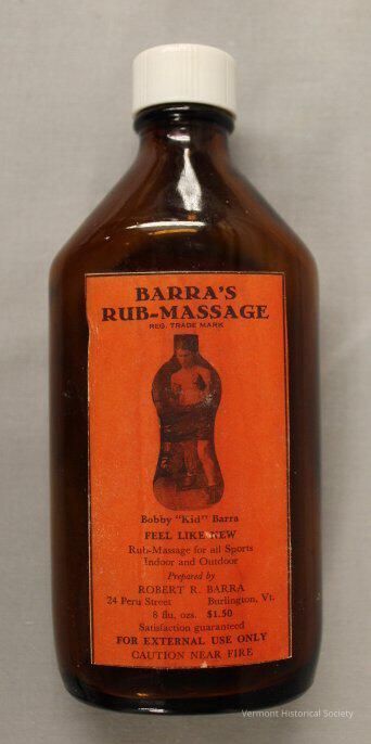 Brown glass medicine bottle with a white plastic cap. There are two rectangular paper labels on the either side of bottle, both orange. One has a photographic image of a boxer with the inscription, "BARRA'S RUB-MASSAGE REG. TRADE MARK Bobby "Kid" Barra FEEL LIKE NEW Rub-Massage for all Sports Indoor and Outdoor Prepared by ROBERT R. BARRA 24 Peru Street Burlington, Vt. 8 flu. ozs. $1.50 Satisfaction guaranteed FOR EXTERNAL USE ONLY CAUTION NEAR FIRE". The other label has directions for use, and list of uses, and ingredients.Context