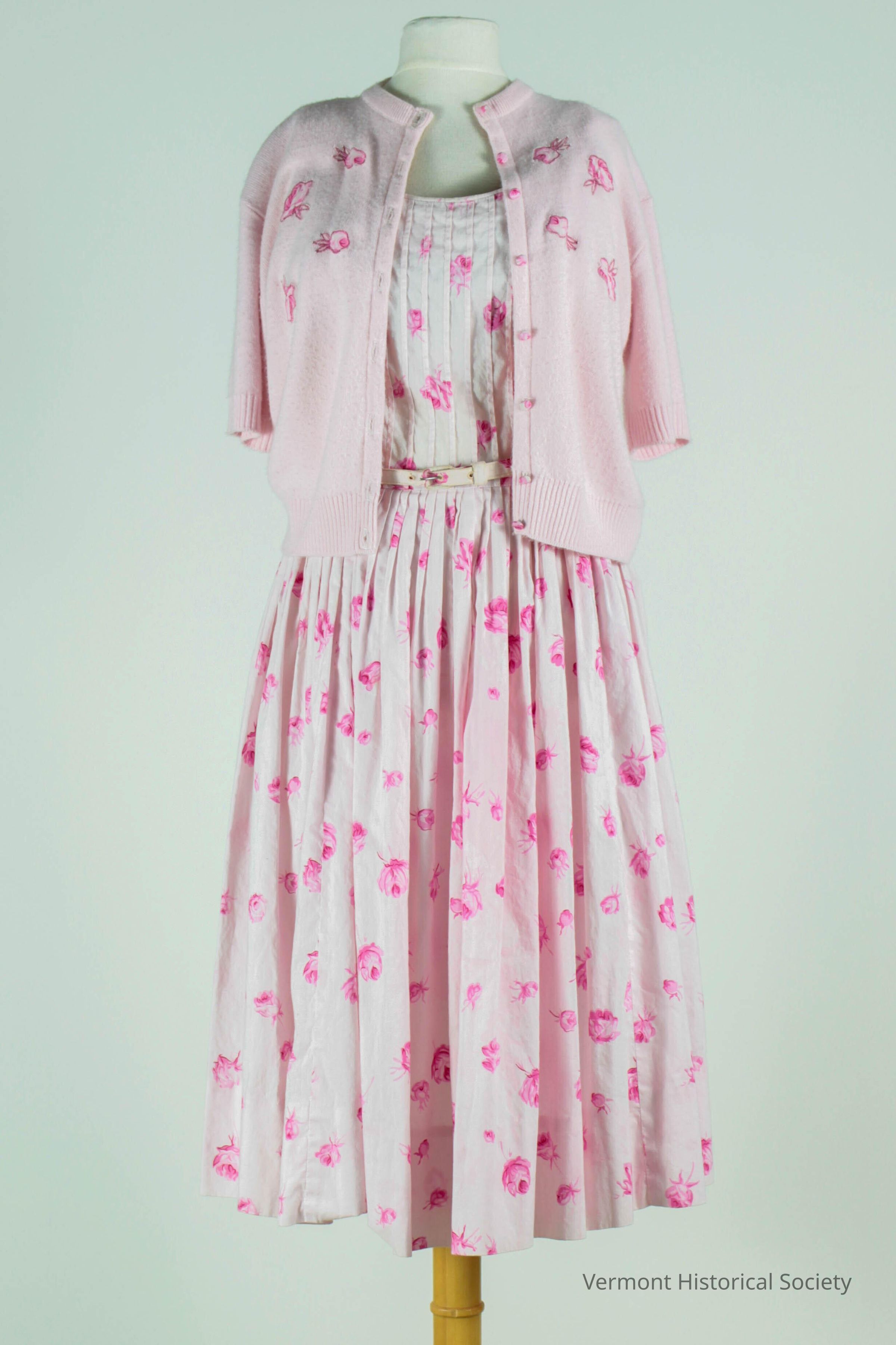 Cotton sundress with matching sweater and belt. The dress is made of pink cotton printed with darker pink flowers. It has a pleated bodice with shoulder straps. The skirt attaches to the bodice with pleats, and there is a tag that reads, "A Jerry Gilders Spactator" with an illustration of binoculars. The synthetic knit sweater has short sleeves and is appliqued on the front with individual flowers from the same fabric as the dress. It secures down the center front with buttons covered in the dress fabric. There is a matching belt with self fabric covered buckle and three holes.Context