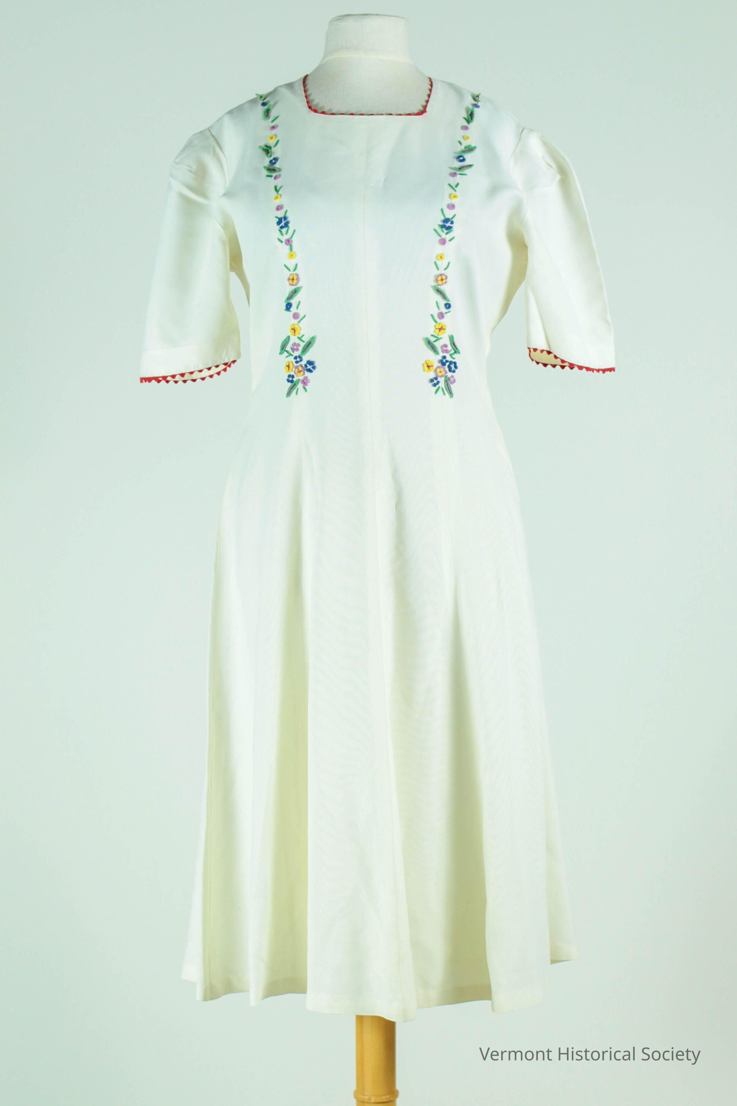 White heavy rayon dress with puffed short sleeves and a square collarless neckline. Red rickrack has been inserted between the show fabric and the lining at the collar and sleeves, creating a scalloped trim. The neckline opens at the center back and secures with a faux pearl button. The princess seams on the front are decorated with felt flowers and leaves from the shoulder seam to the wearer's waist. There are two ties on either side of the waist that tie at the back in order to fit the dress to the wearer. The dress opens on the proper left with a 10-1/2" zipper spanning from below the armscye to the hip.Context