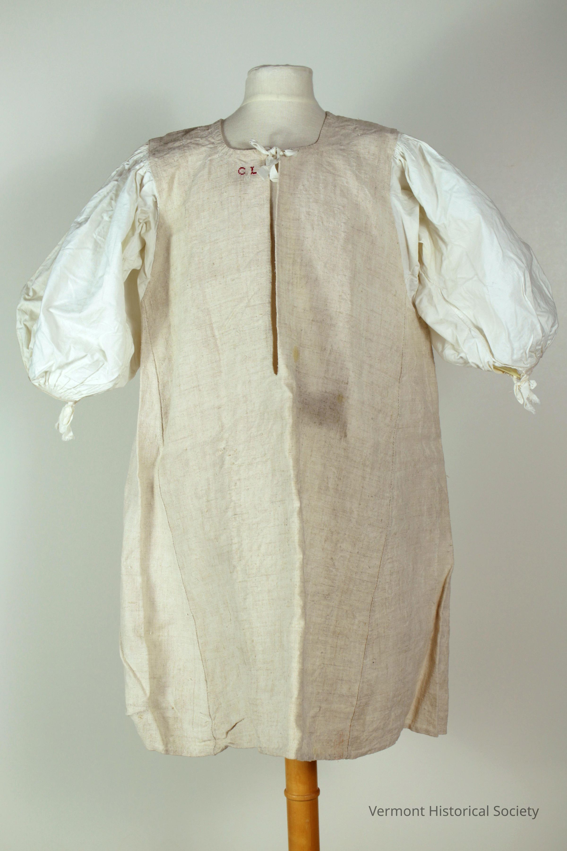 Shirt with a body of heavy white linen and sleeves of white cotton. The shirt is cut into an A-line. The neck splits at the center front to about 3 inches below the bottom of the armscye. The neckline secures closed with two cotton ties. The proper right side of the neck opening is marked in red thread with the letters "C L". The sleeves are cut very full an end in draw strings near the wearer's elbows.Context