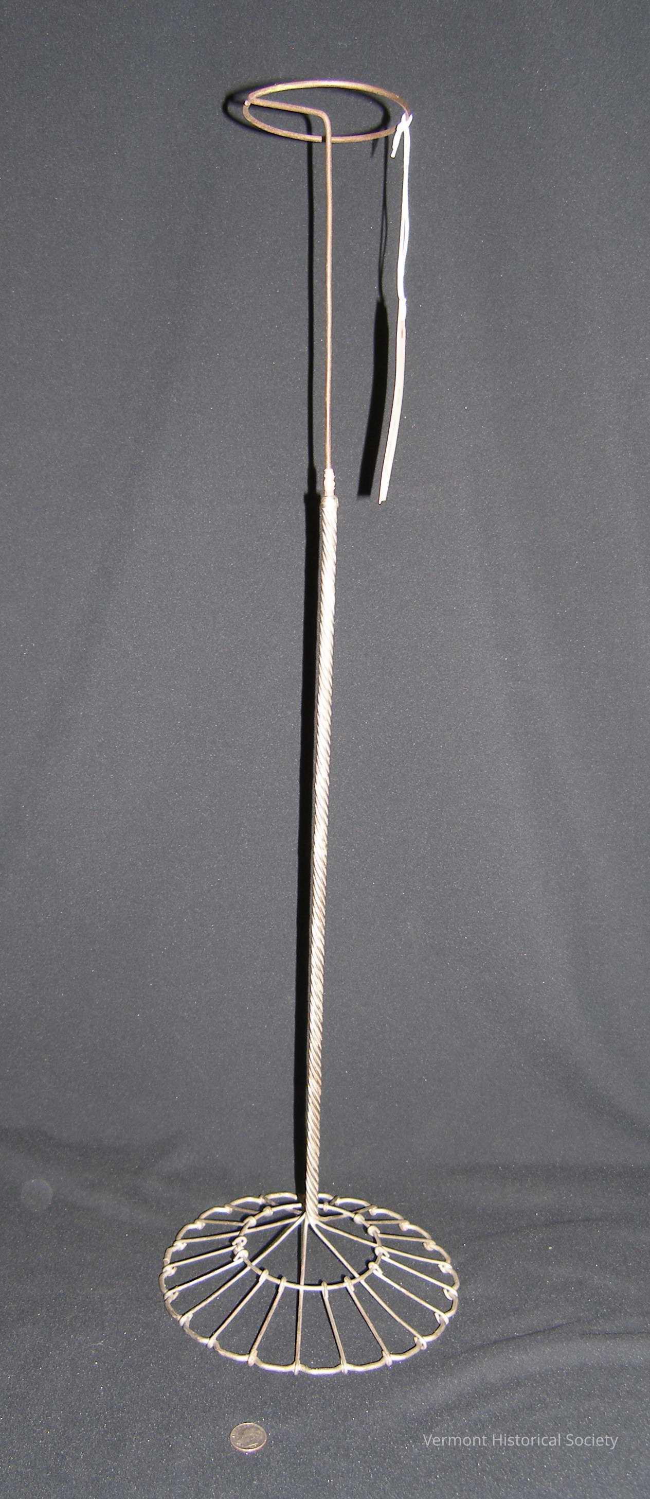 The tall hat stand is made of wire and features a fluted base composed of wires that are evenly spaced in a circular pattern. Seven of the wires are twisted upward to create a 15.75" rod, from which extends a single 7" wire forming a circle at the end to hold a hat.