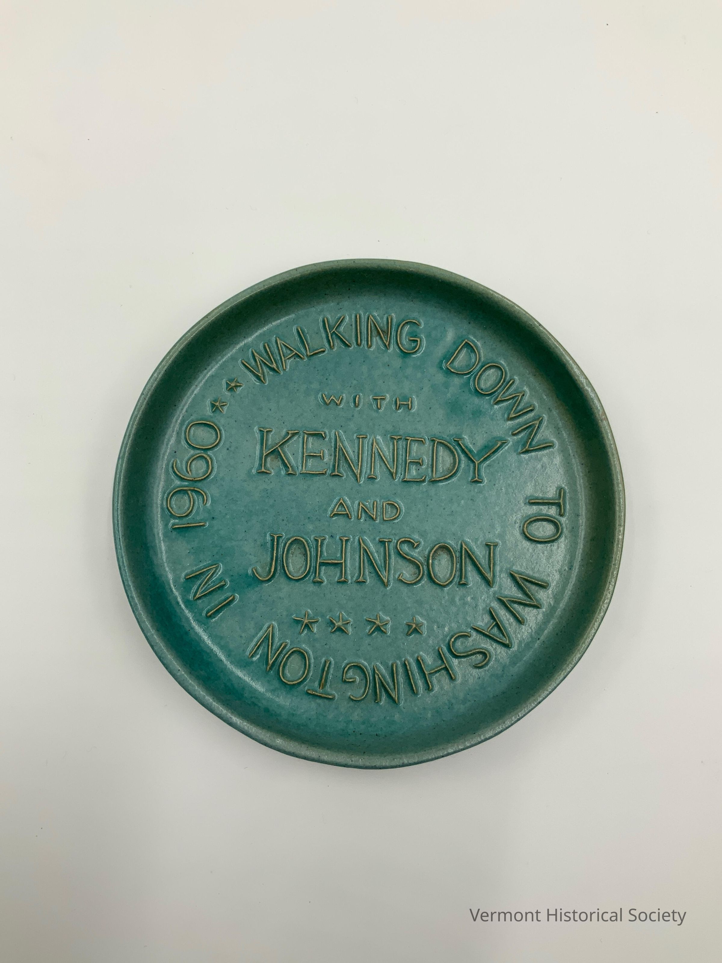 Ashtray molded with the words "WALKING DOWN TO WASHINGTON IN 1960 WITH KENNEDY AND JOHNSON". The ashtray is glazed with a matte, green glaze. The bottom is unglazed and stamped with the mark, "VERMONT DESIGN COOPERATIVE BENNINGTON POTTERS *1290".Context