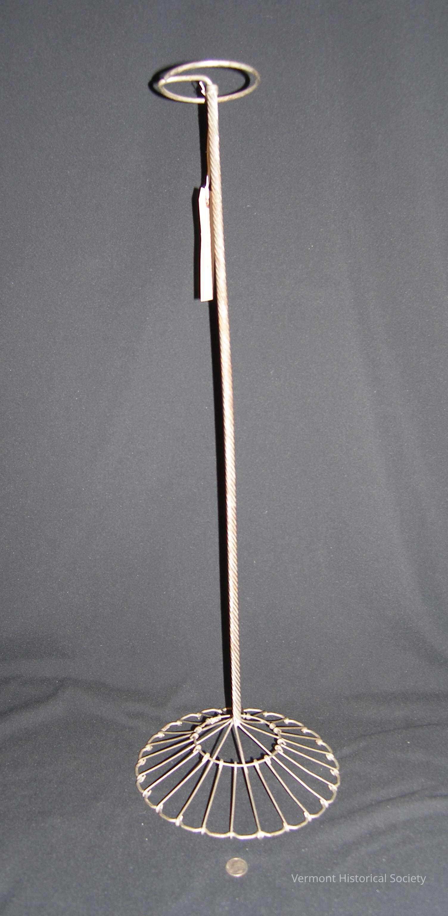 The tall hat stand is made of wire and features a fluted base composed of wires that are evenly spaced in a circular pattern. 8 of the wires are twisted upward to create a 21.5" rod, from which extends a single 7" wire forming a circle at the end to hold a hat.