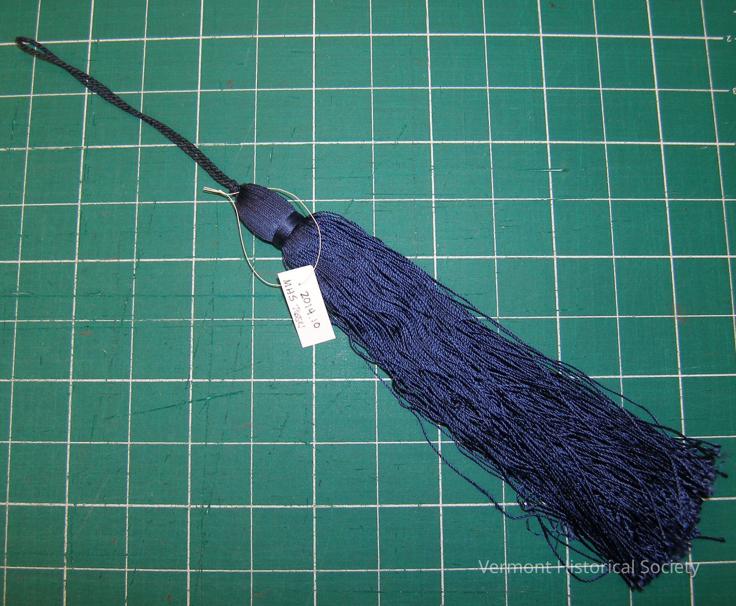 Tassel from Montpelier High School, class of 1939, owned by donor's mother Una Clark Trepto (1920-2014). Dark blue tricot tassel on a cord / long loop, the kind that often goes on an academic cap or mortarboard.Acquisition