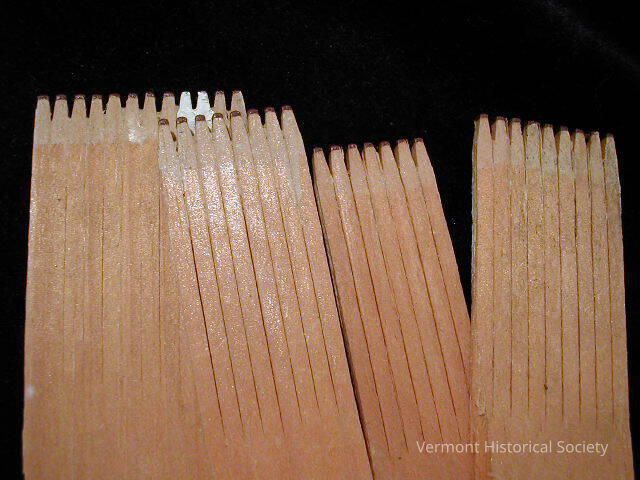 Wooden stick matches. The matches are partially split, with a small uncut portion at the bottom. The other ends are tapered and tipped with a red substance