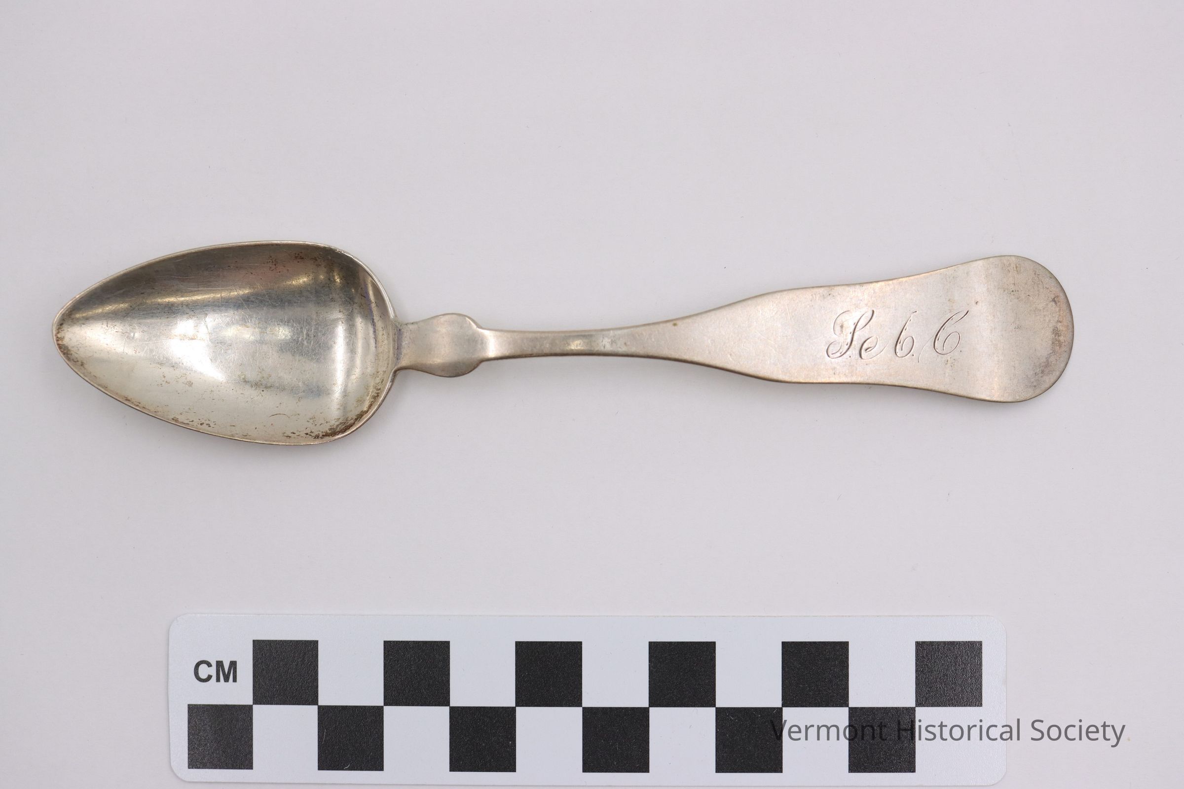 Silver teaspoon with a slightly pointed bowl and rounded shoulders. The handle is engraved with the initials "S.A.C." The reverse is marked "LUDLOW,VT." at the shoulder, and "B.M.BAILEY" on the handle.