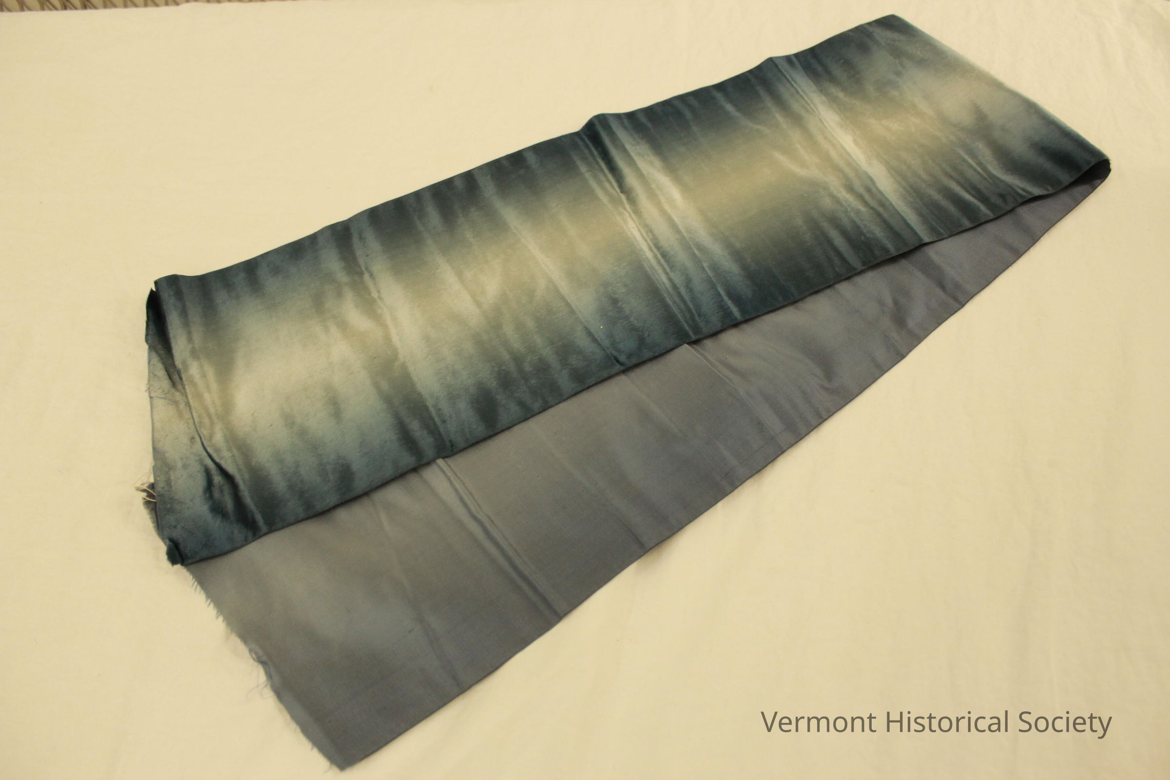 A teal blue strip of silk fabric that is dyed darker on the edges and paler in the middle. Rough cut on the ends.Context