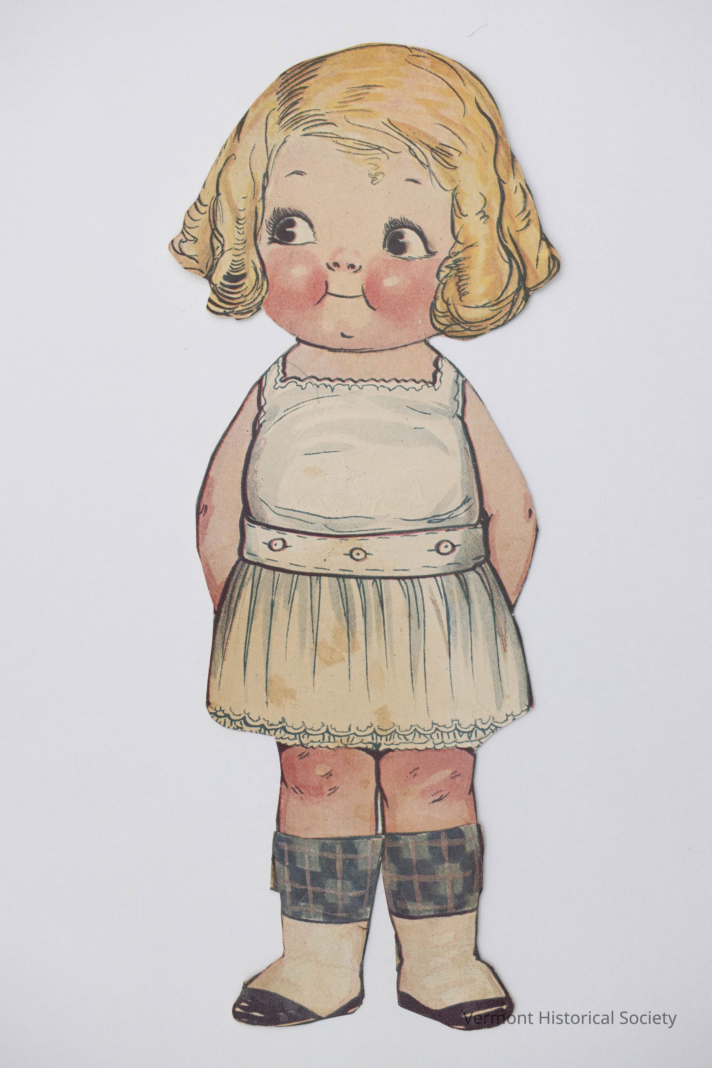 Small paper doll. The doll depicts a young child with yellow hair and pink skin wearing a white dress undergarment, plaid socks, and black-and-white shoes. The back shows a portion of a magazine page and the handwritten label, "Lesta".Context