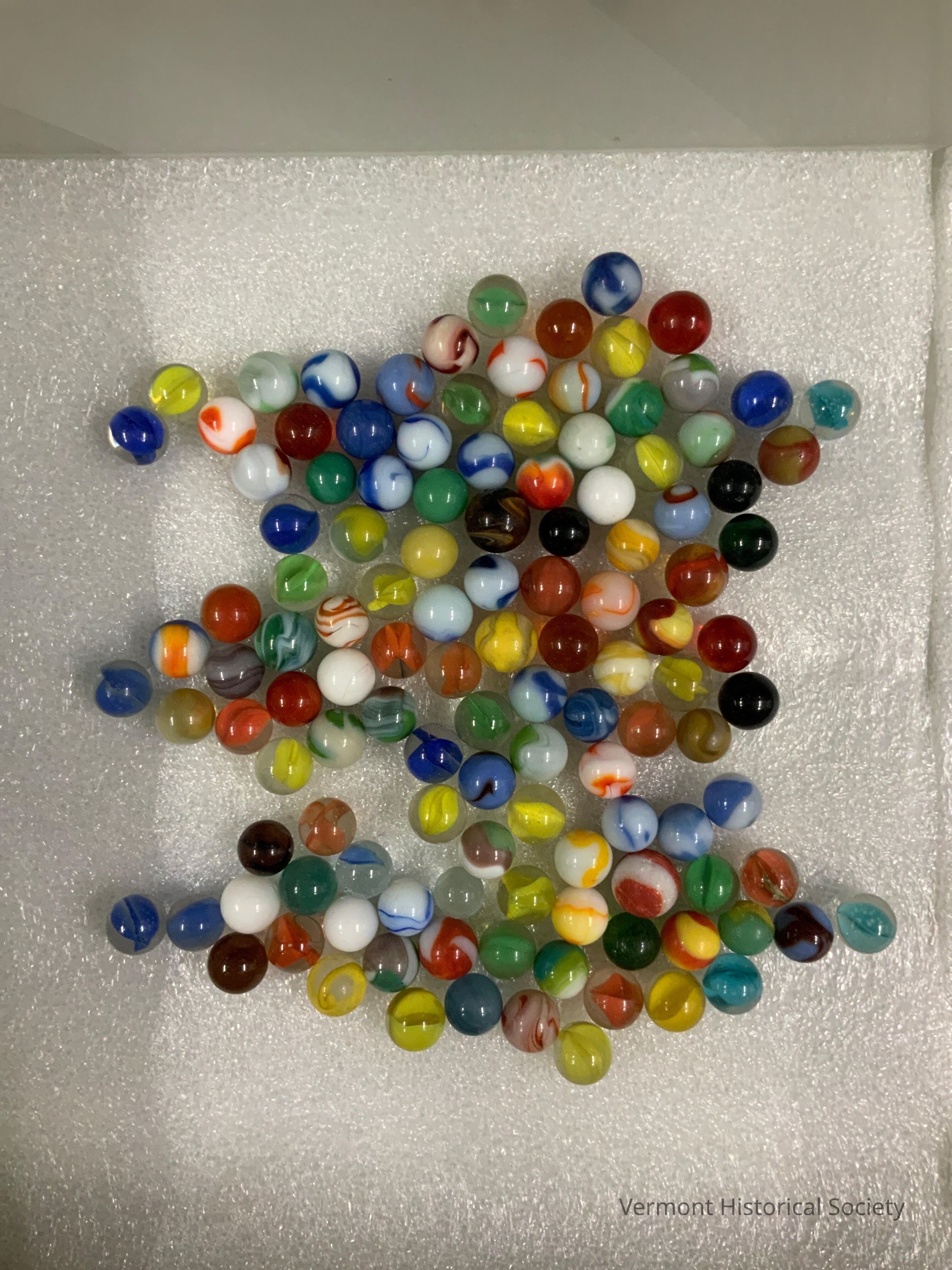 122 glass marbles. The marbles each consist of at least 2 colors of glass swirled together, with the exception of 4 solid white marbles, 4 solid black marbles, 1 red, 1 blue, and 1 green.Context