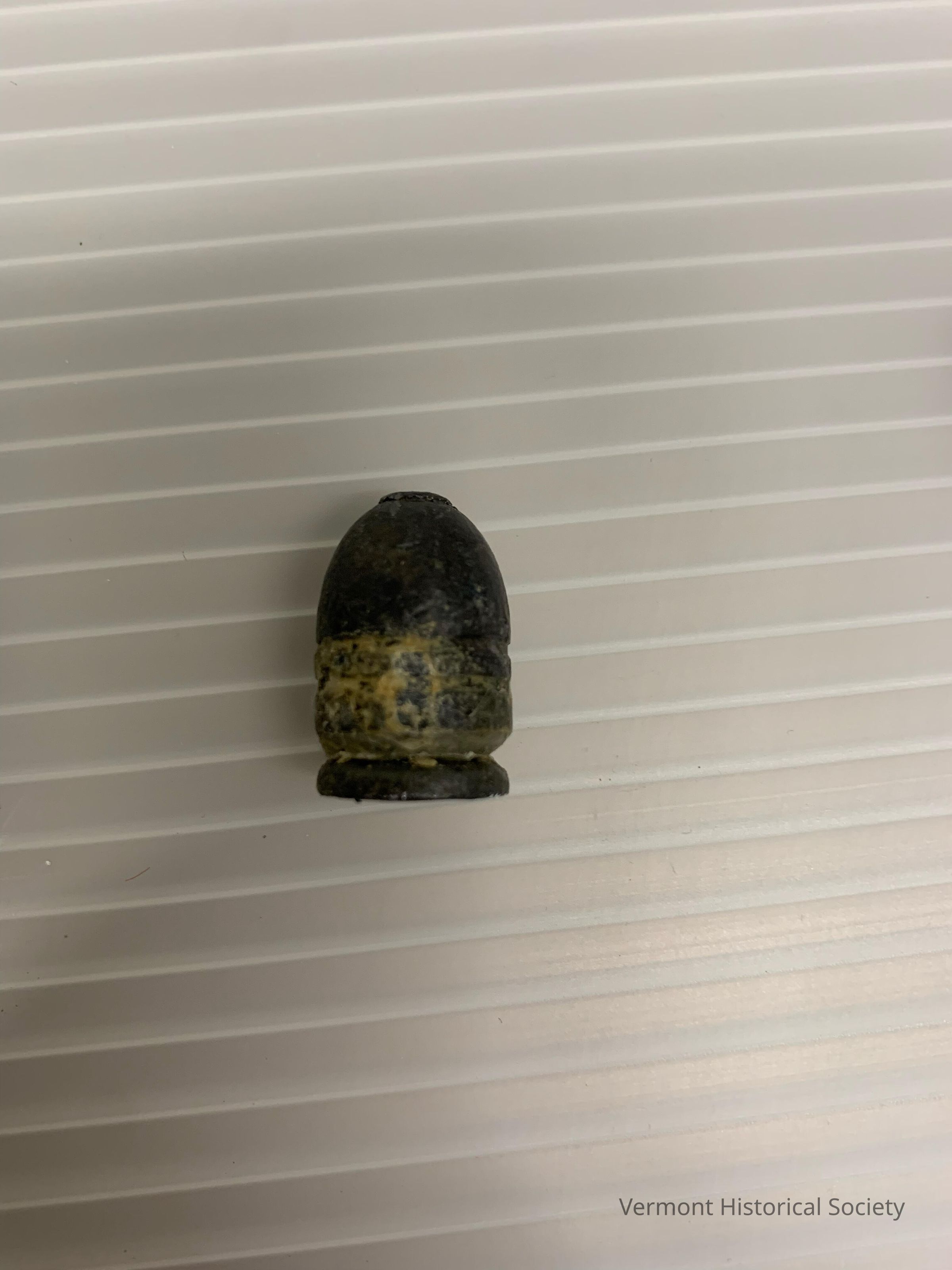 Lead bullet. The bullet is pointed at one end and has three lines molded around it, two shallow and one deep.Context