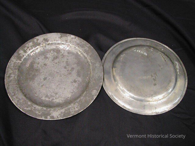 Round pewter plate with a raised rim. The bottom is marked with a lion and the initials "T. D."