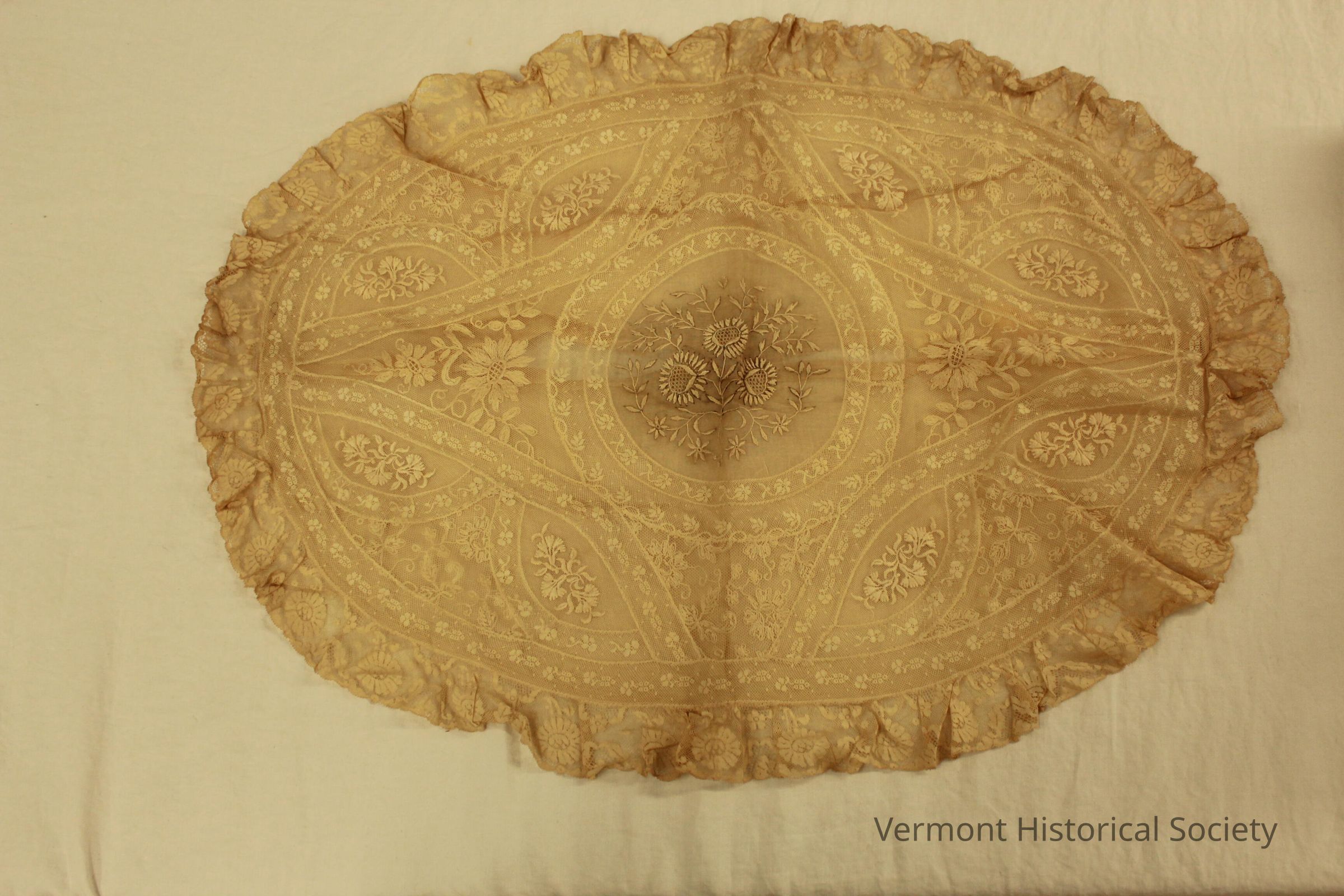 Linen lace pillowcase, oval in shape, buttons in back.Context