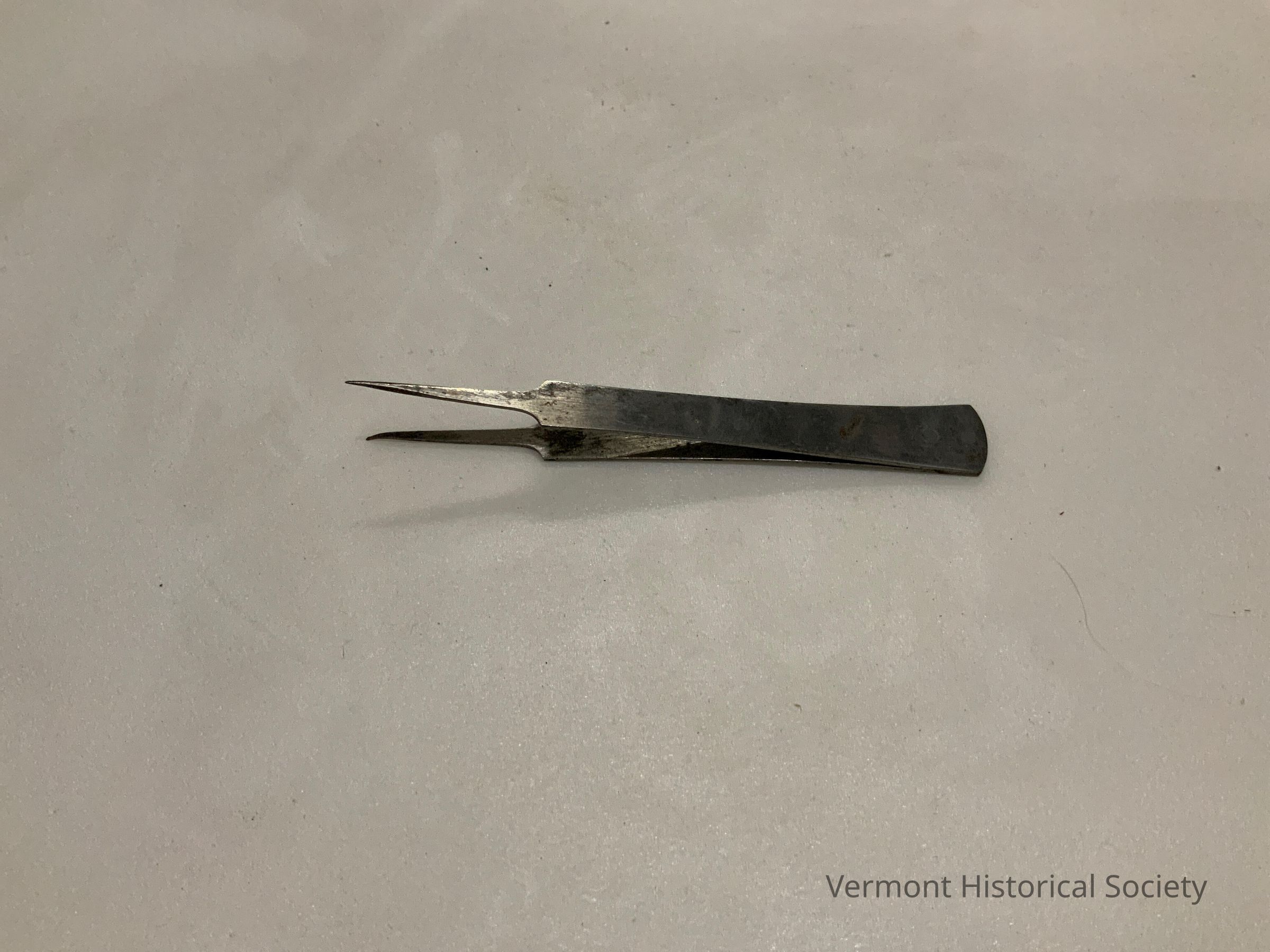 Small metal tweezers. The tweezers are connected at the top, causing them to spring open at the other ends. The ends are sharply pointed.Context