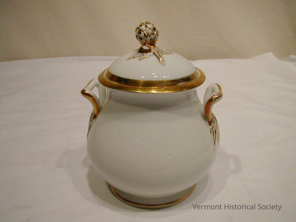 White-bodied ceramic sugar bowl and lid. The bowl is round with a flaring lip and sits on a round base. There are square handles on either side, decorated with gilding. The lid is topped with a seed pod sitting on a bed of leaves.