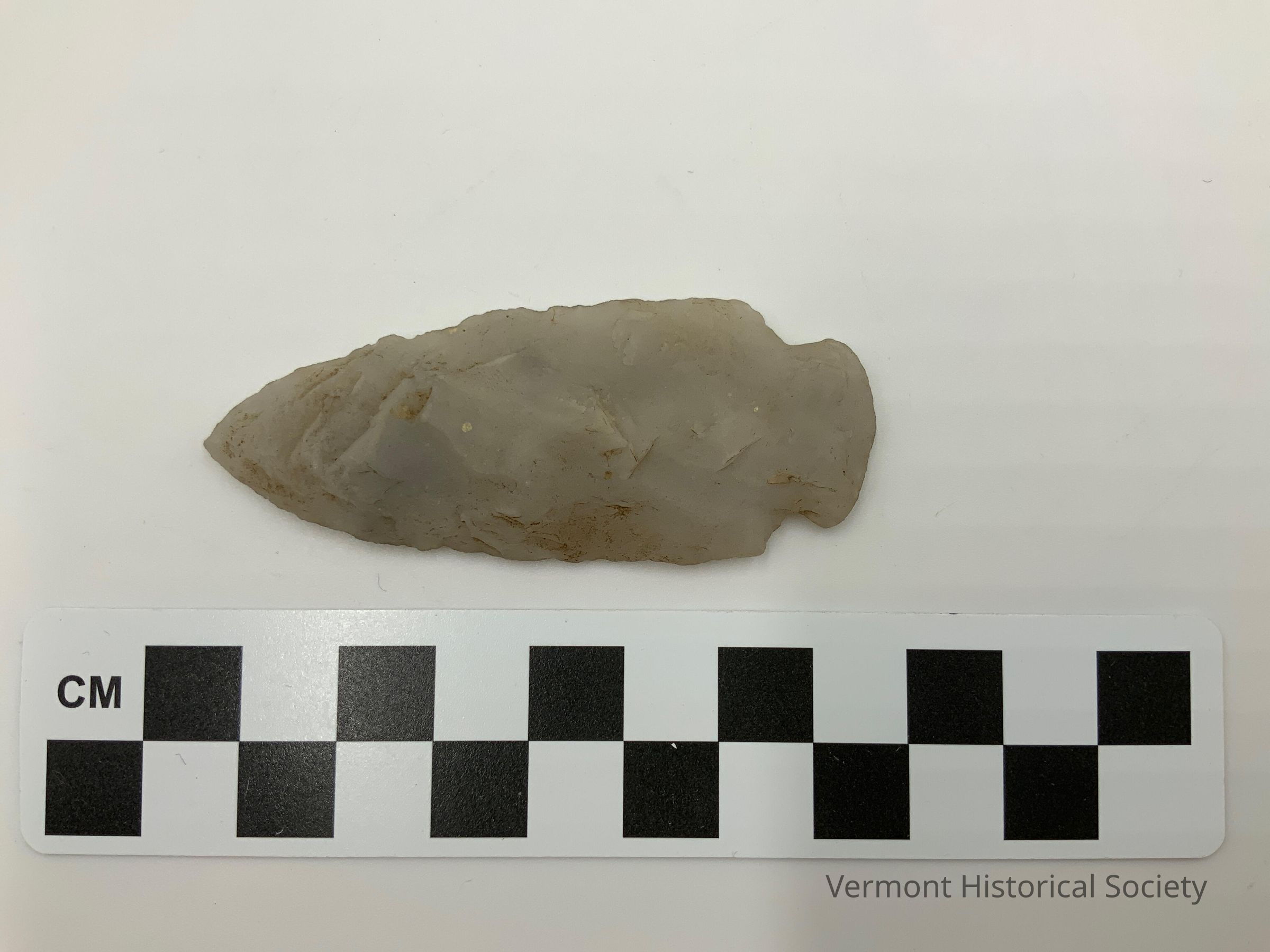 Chipped stone projectile point with corner notches. It is made of gray quartz. The base and the blade edges curves outward.