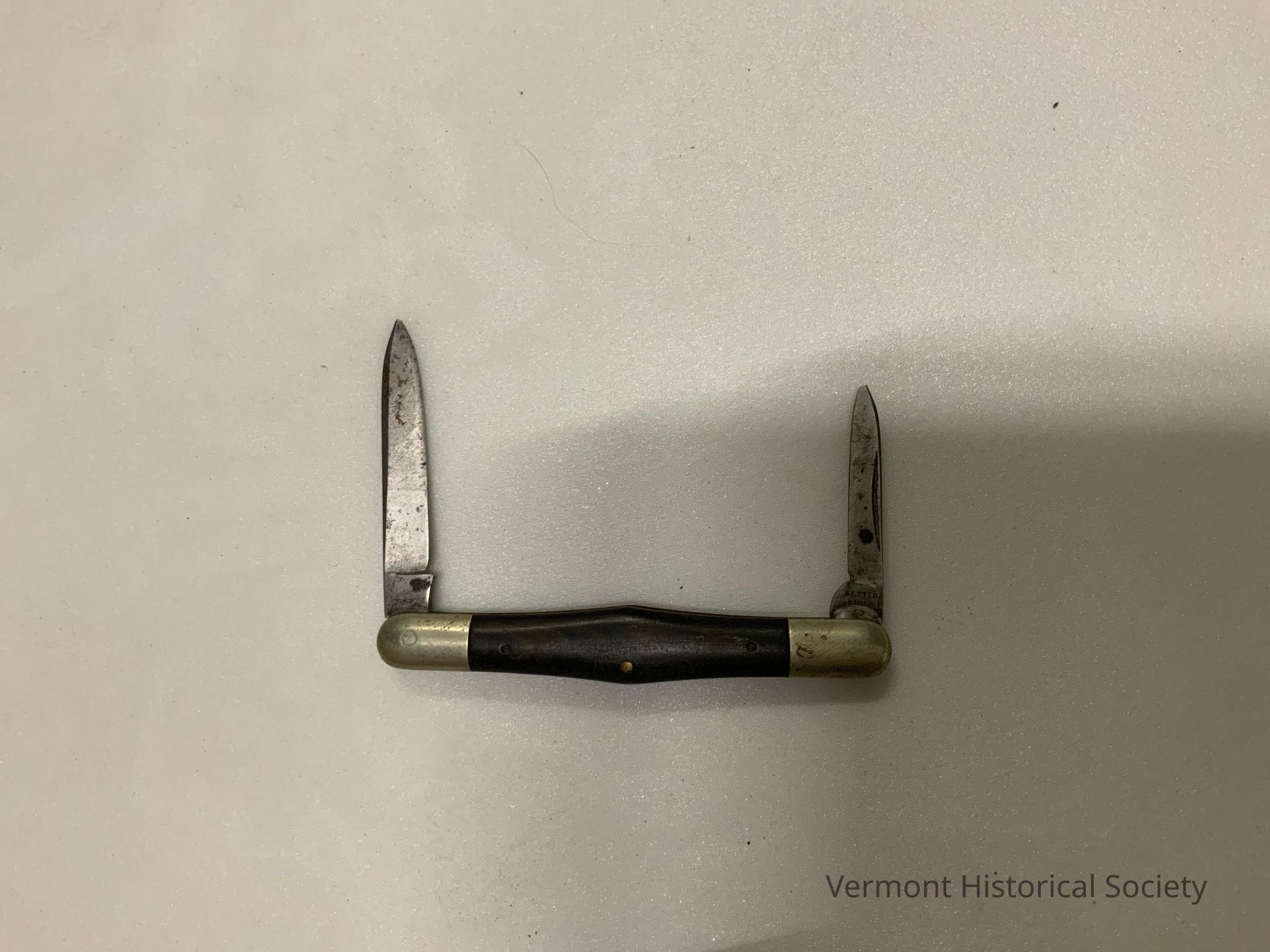Pocket knife with two blades. The handle is turned black wood with silver mounts. Inside are two fold out blades, each connected to and hinging from the opposite end, but opening on the same side. They each have a small divot at the top for pulling out of the handle. The small blade is marked, "ULSTER KNIFE" near the base.Context