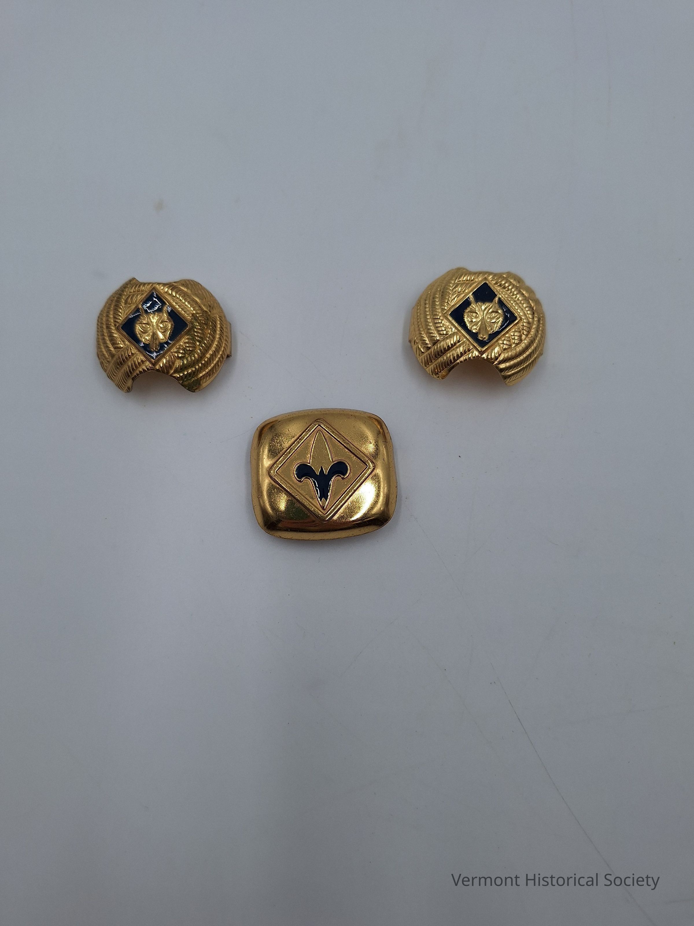 Three Cub Scout metal scarf holders. Each scarf holder is gold in color with bent tabs in the back to hold a scarf.