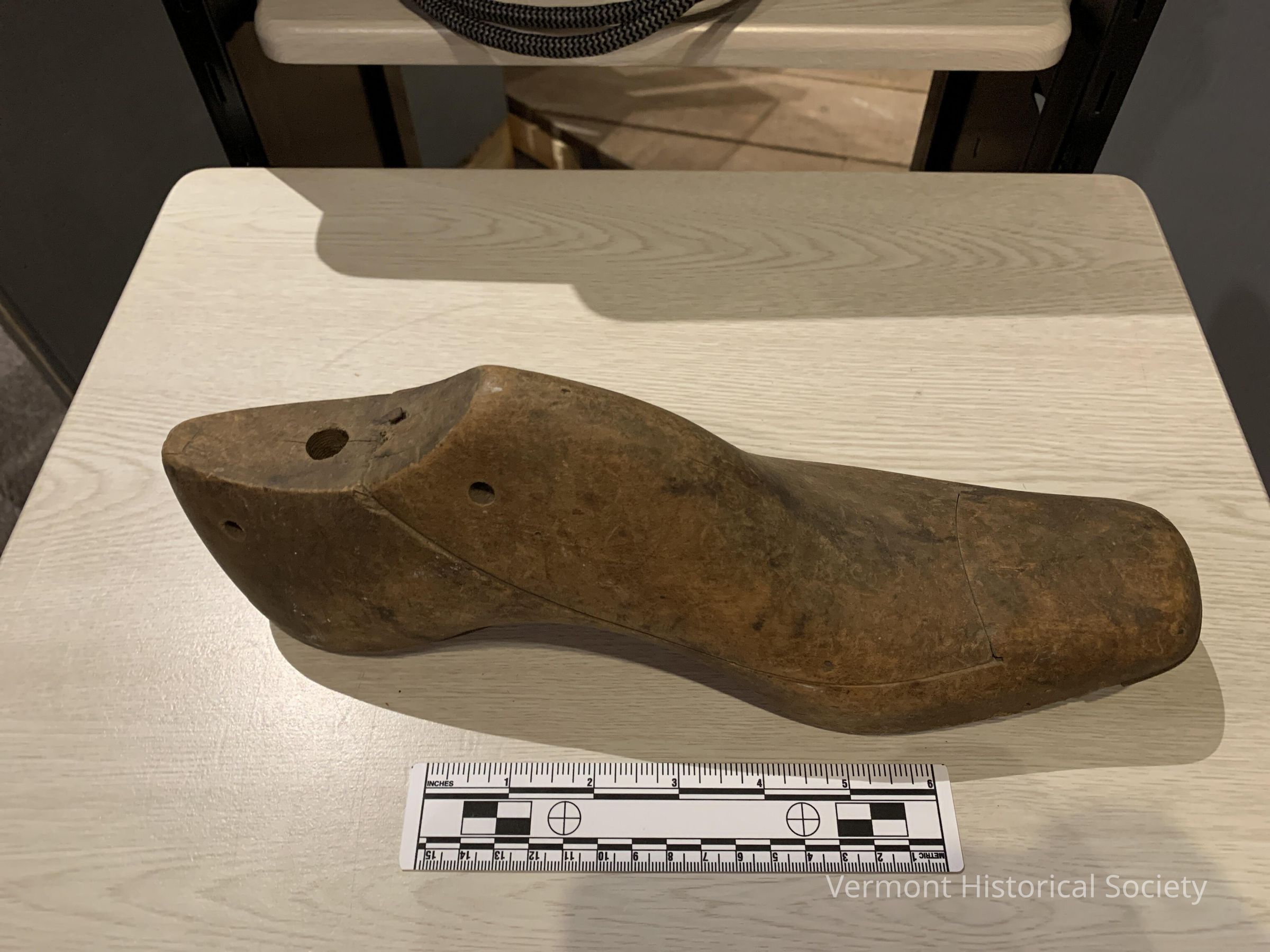 Wooden shoe last. The upper portion of the foot is cut separately from the body and can be removed. There is a hole through the upper heel for hanging.