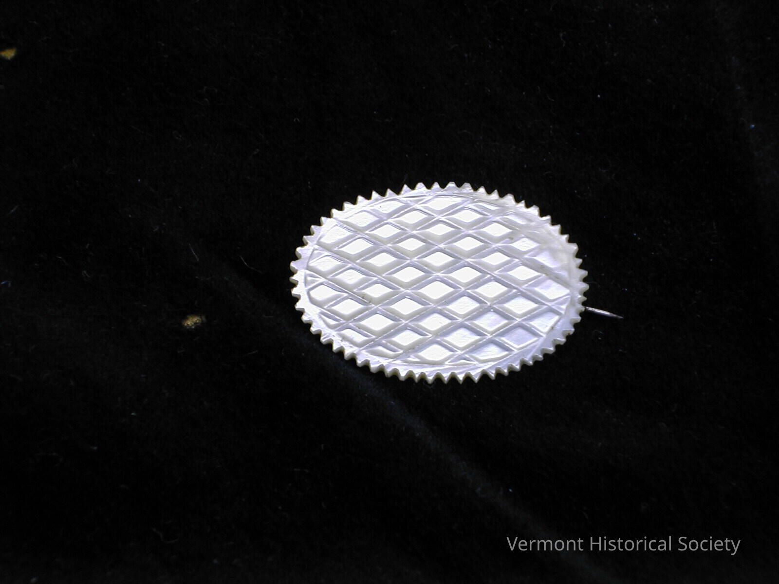 Oval brooch carved from a white, pearlescent material. The edges are carved in a chevron pattern, and the center is carved with a diaper lattic.