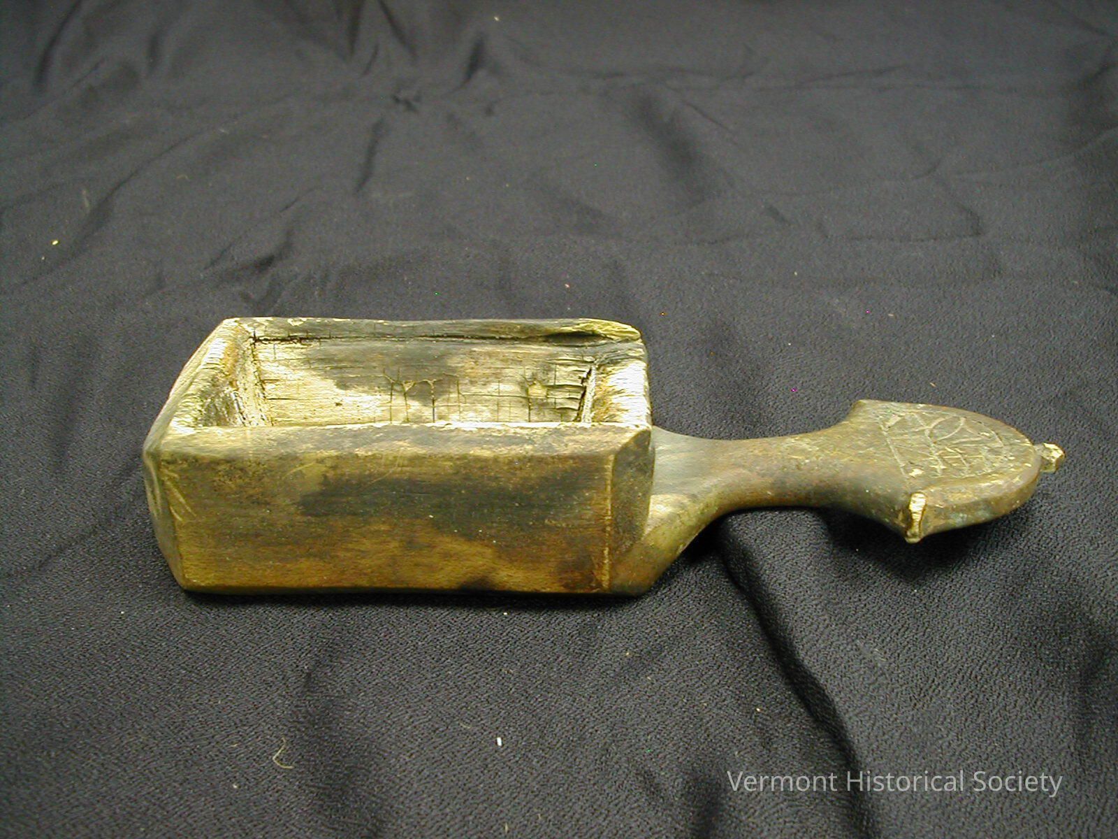 Hand-carved wooden soap dish with an extending handle. The crudely carved dish is rectangular with sides that angle outward toward the top. The interior surface is covered in white paint. The outside of one side of the dish is carved with the inscription, "Capt. O Bizell Ve91/Prisner Februry 1777/Opon N:TO". The handle narrows in the center, then flares into a fan shape, and is carved with a geometric floral pattern.
