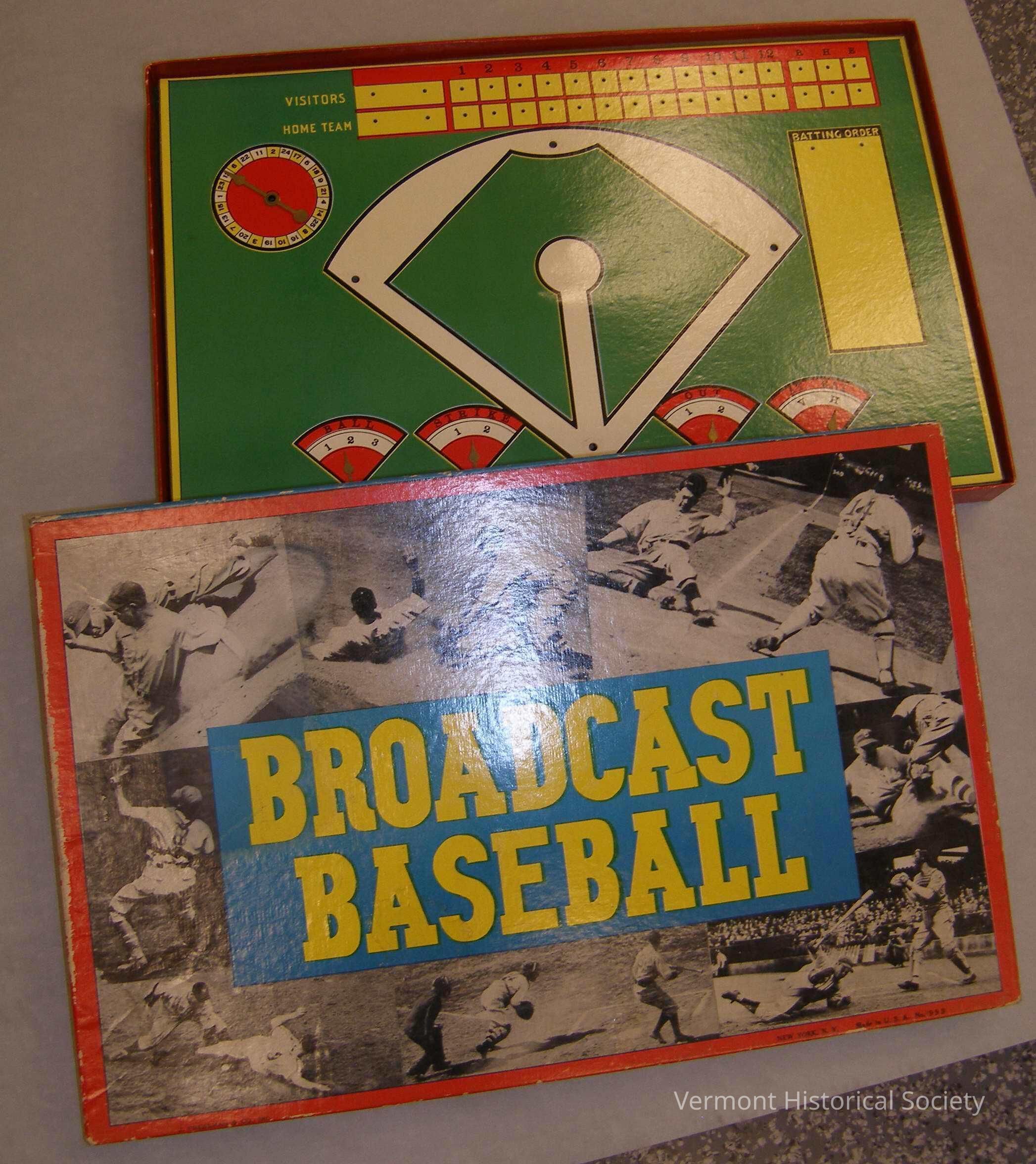 Directions for play are printed on the interior of the box lid. Conventional play follows the rules of baseball, but the players spin a dial and match the result to the numbered game outcome printed in the box lid. There are also alternative instructions for using the board to reenact live games via radio broadcast.Context