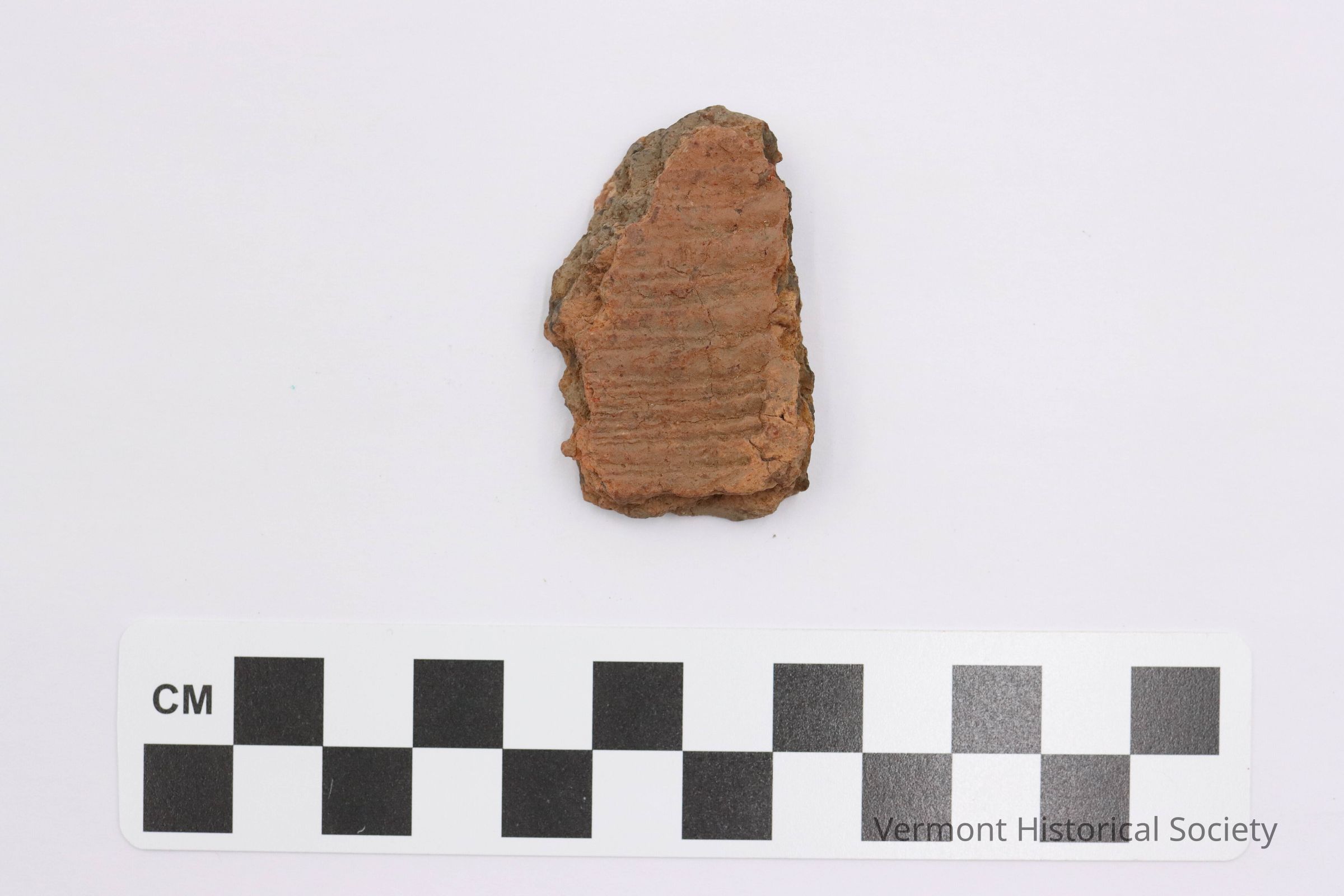 Pottery body sherd with rocker stamped decoration.