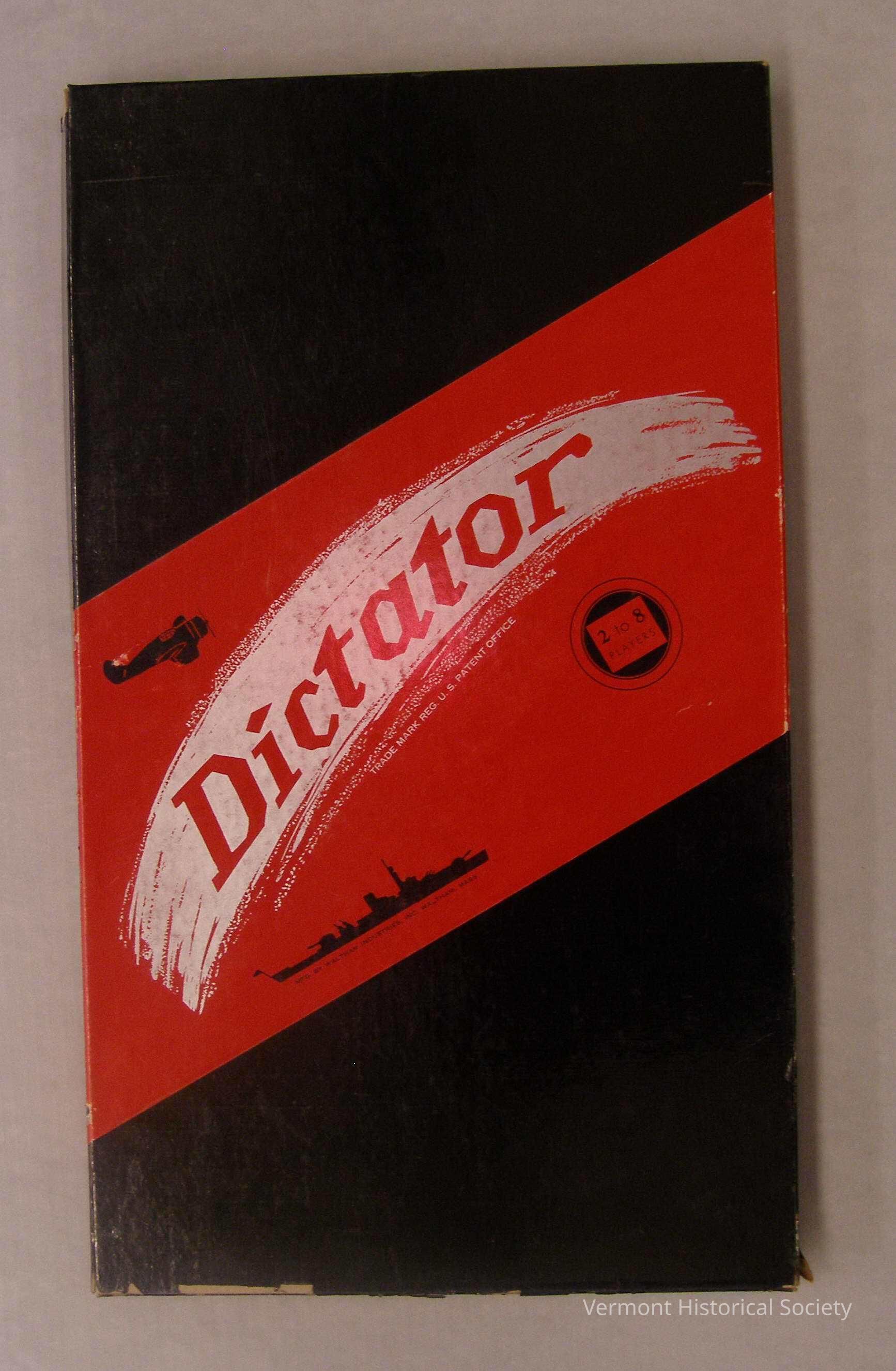 Boxed board game, "Dictator". The game consists of the box, game board, play money, cards noting actions and property, metal ships, submarines, airplanes, and people, and 2 dice. Instructions for play are printed at the center of the game board.Context