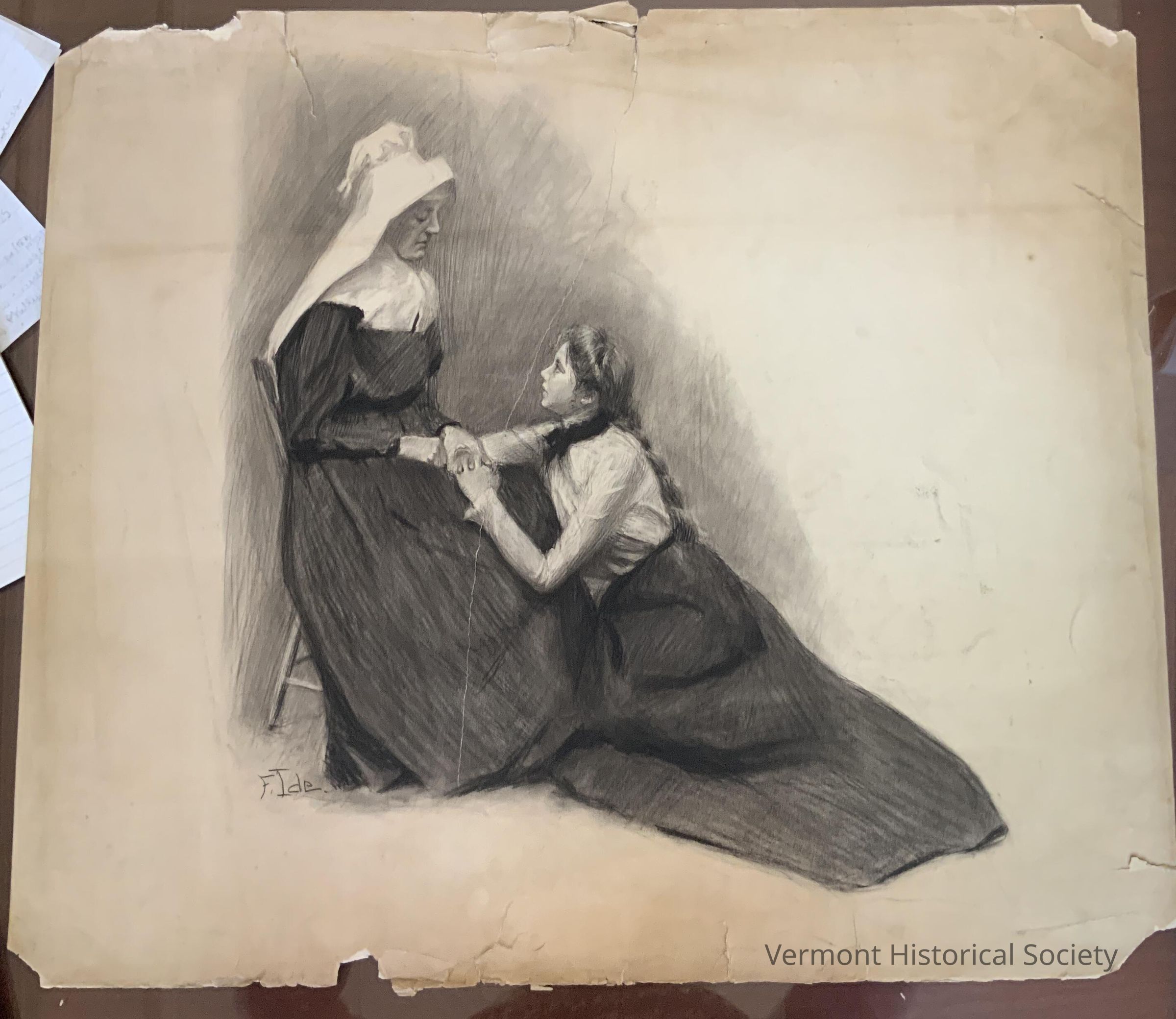 A drawing of a woman kneeling at the foot of an older woman a headdress and black dress. The kneeling woman has braided hair and wears a light top with a tie and a dark skirt. There are shadows behind them. It is signed in the bottom left corner and undated. The back has been repaired.Type of Drawing